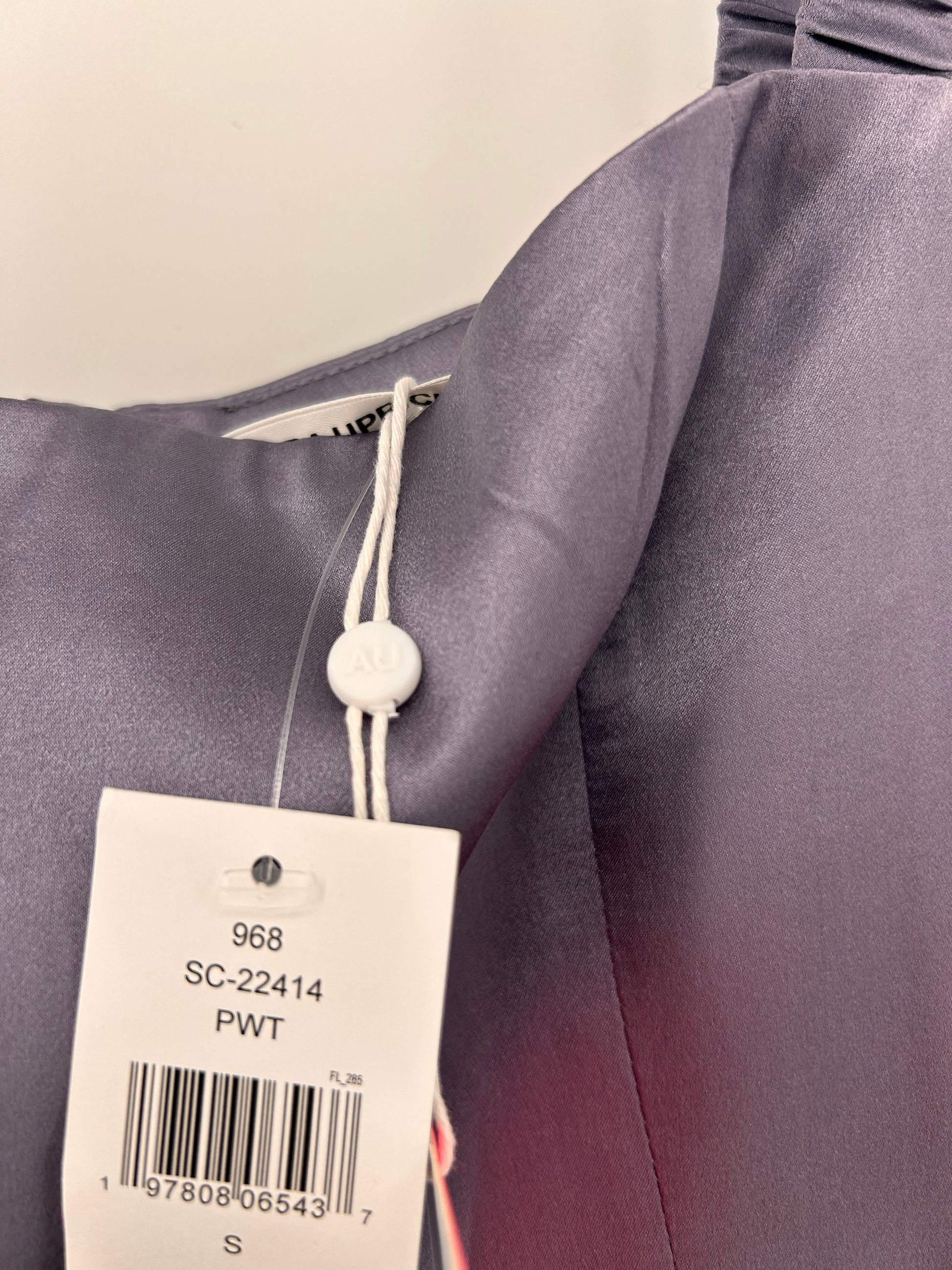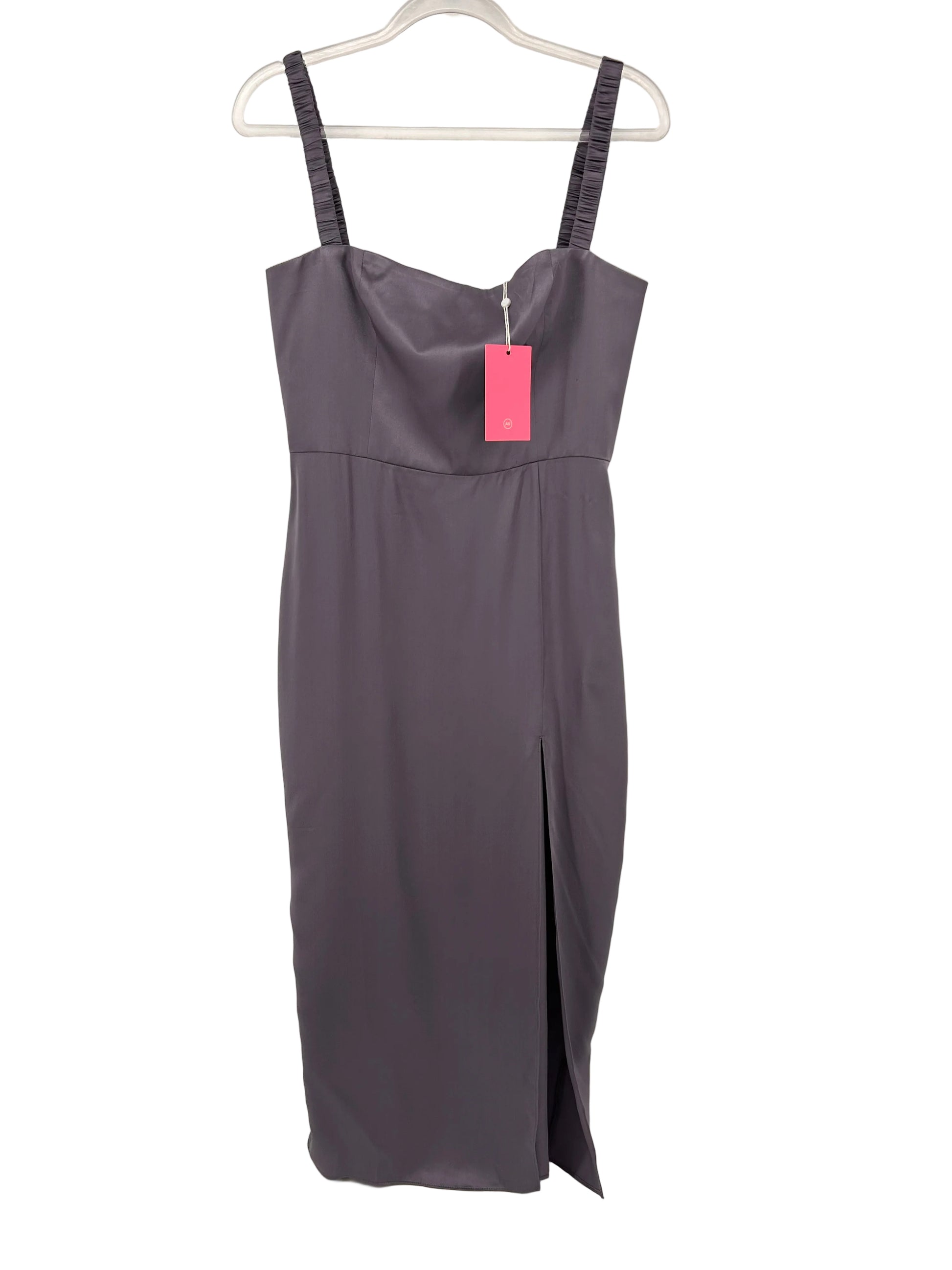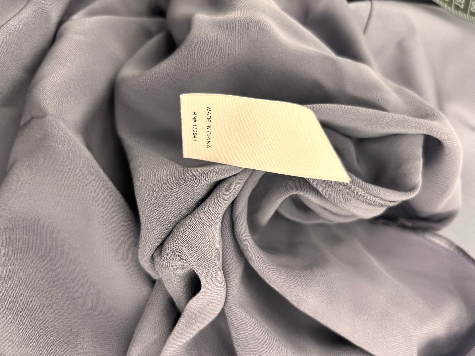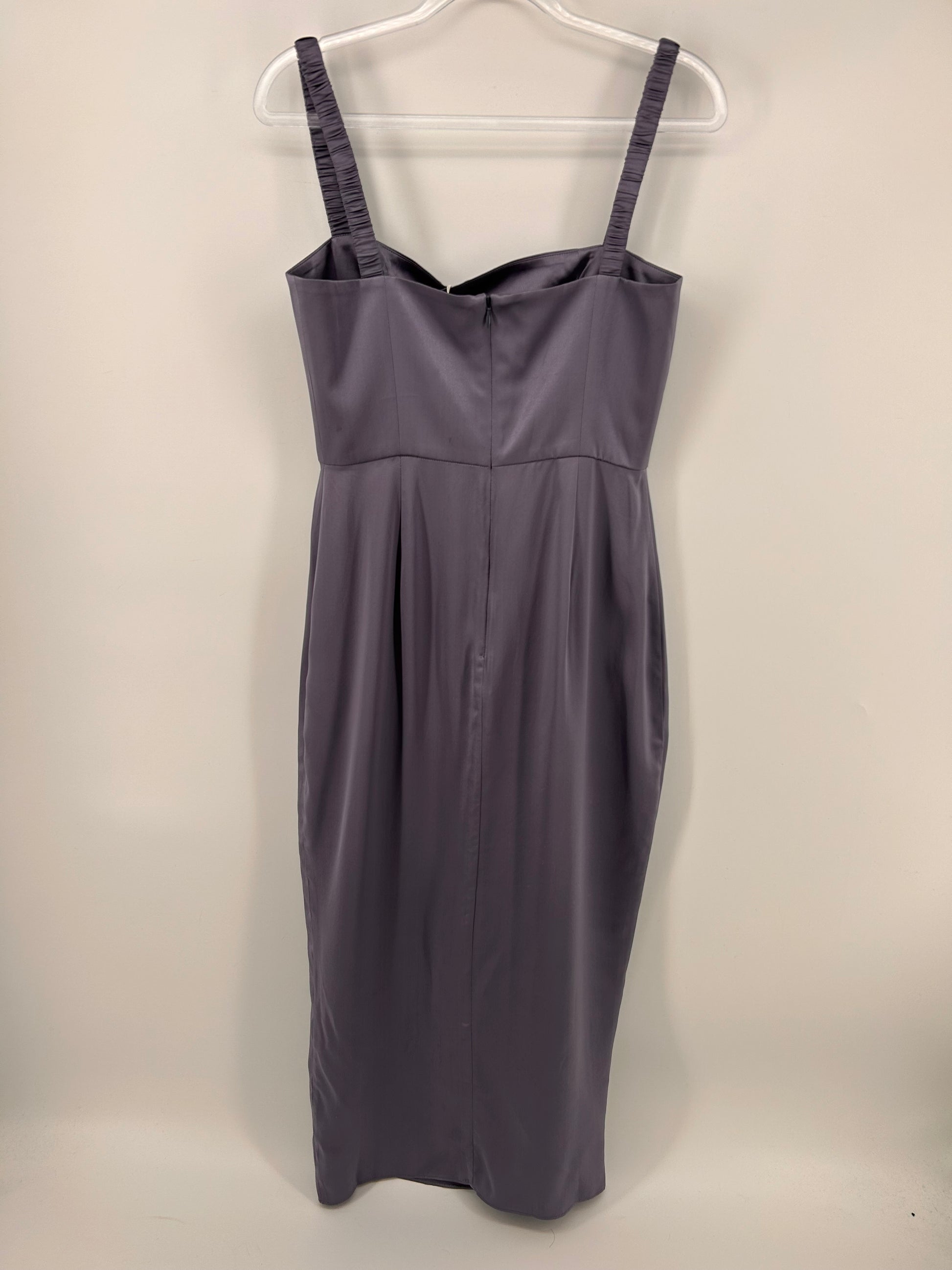 The Amanda Uprichard Mileena 100% Silk Dress in Pewter Gray Blue is a formal and elegant occasion dress perfect for weddings, parties, or cocktails. Made from luxurious silk with a satin fabric type, this sleeveless dress features a square neckline and a zip closure. The dress falls to a midi length with strappy sleeves, making it a flattering and stylish choice for any season. The subtle metallic theme adds a touch of sophistication to this sheath dress from a reputable brand known for quality and design.