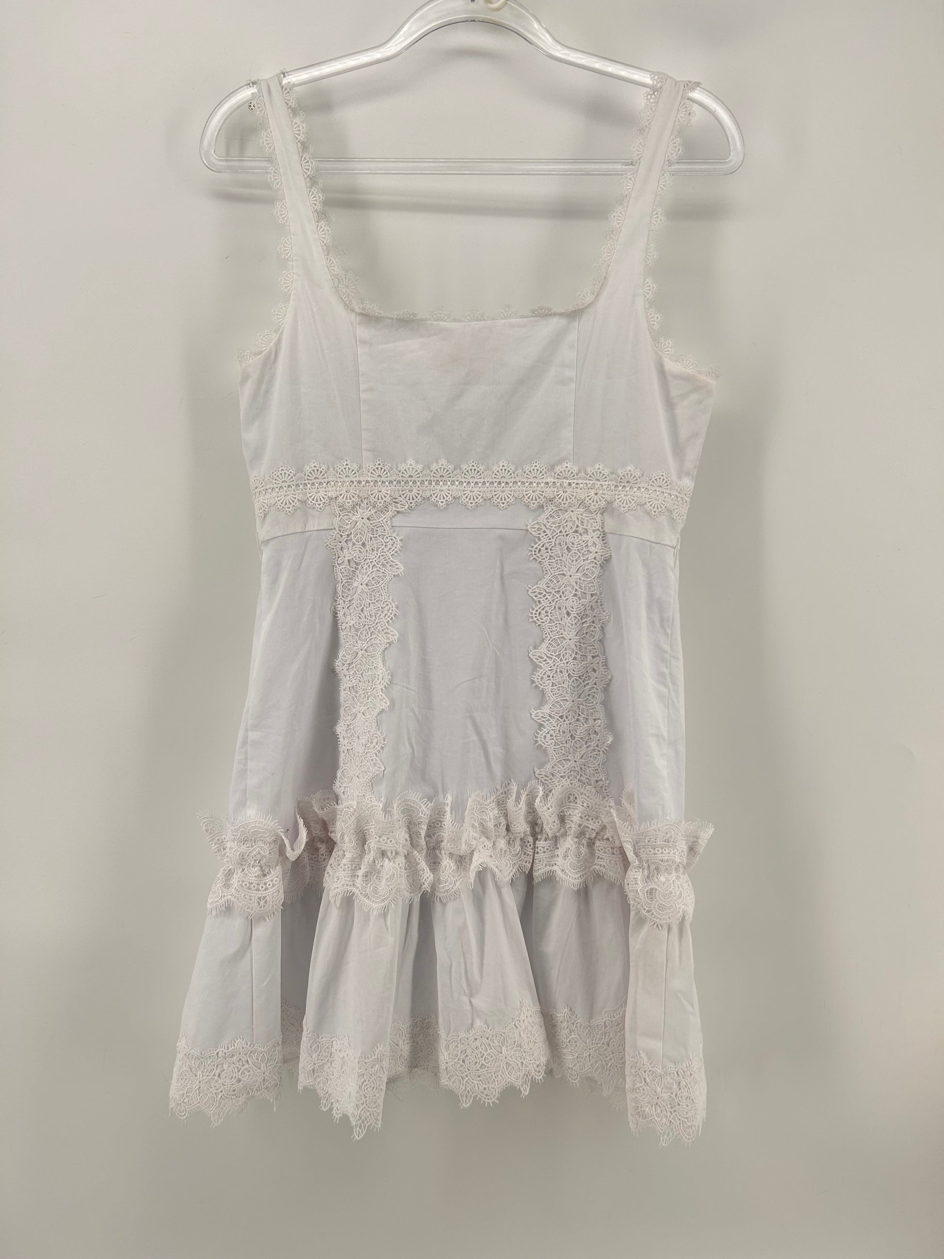 The Cinq a Sept Aziza Lace Embellished Mini Dress is a stunning women's size 4 dress perfect for parties and cocktail events. Featuring a square neckline, sleeveless design, and strappy sleeves, this short dress is made from white cotton lace fabric with ruffle accents. It has a button closure and is ideal for summer and spring seasons, making it a chic and stylish choice for any designer-themed occasion. New with tags White Size 4 Measurements Bust 17” Waist 15” Length 33” |