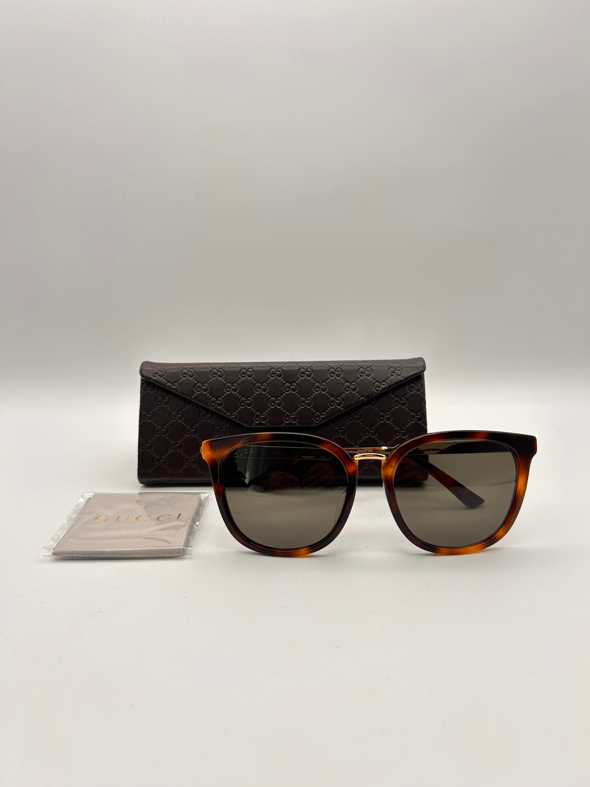 Gucci GG Sunglasses GG0079SK Women's Brown Tortoise frames with Gold Arms and Classic Stripe with GG logo on temples Good condition 56-19-145 Comes with case and cloth |