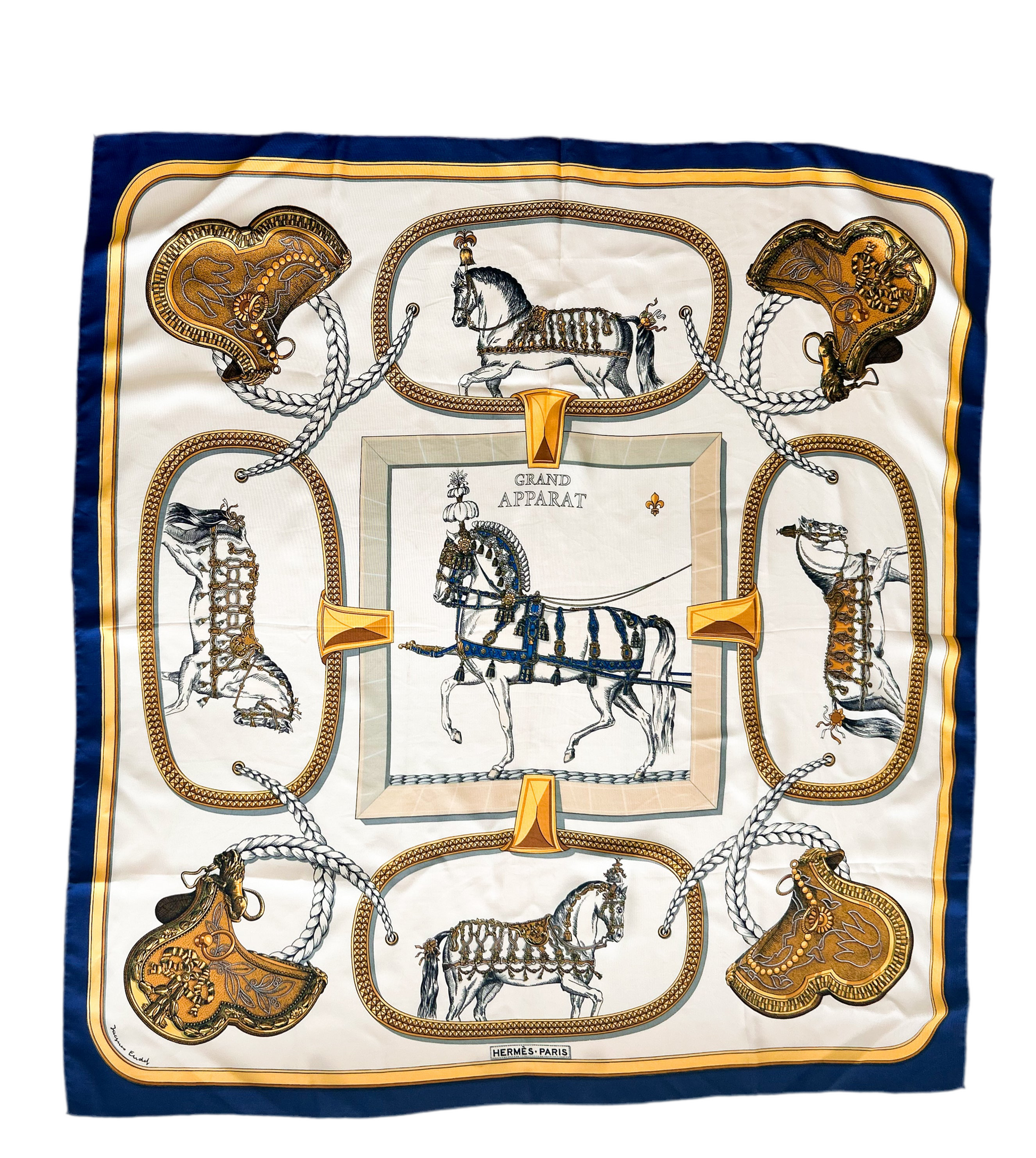 Hermès Paris Silk Foulard/Сarre Vintage “Grand Apparat” or Great Ceremony Depicting Horses in Ceremony Regalia Design by Jacquard Eudel 1962 early Issue. The always dramatic and ever so popular “Grand Apparat” has quickly became an Iconic Hermès scarf after its first debut in 1962. Eudel’s masterpiece has been reissued numerous time. Here is an early issue in vintage condition with minor staining.