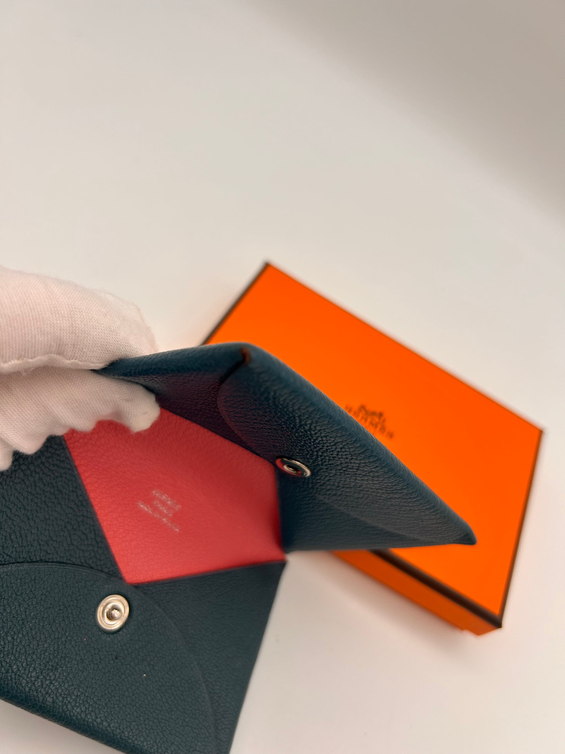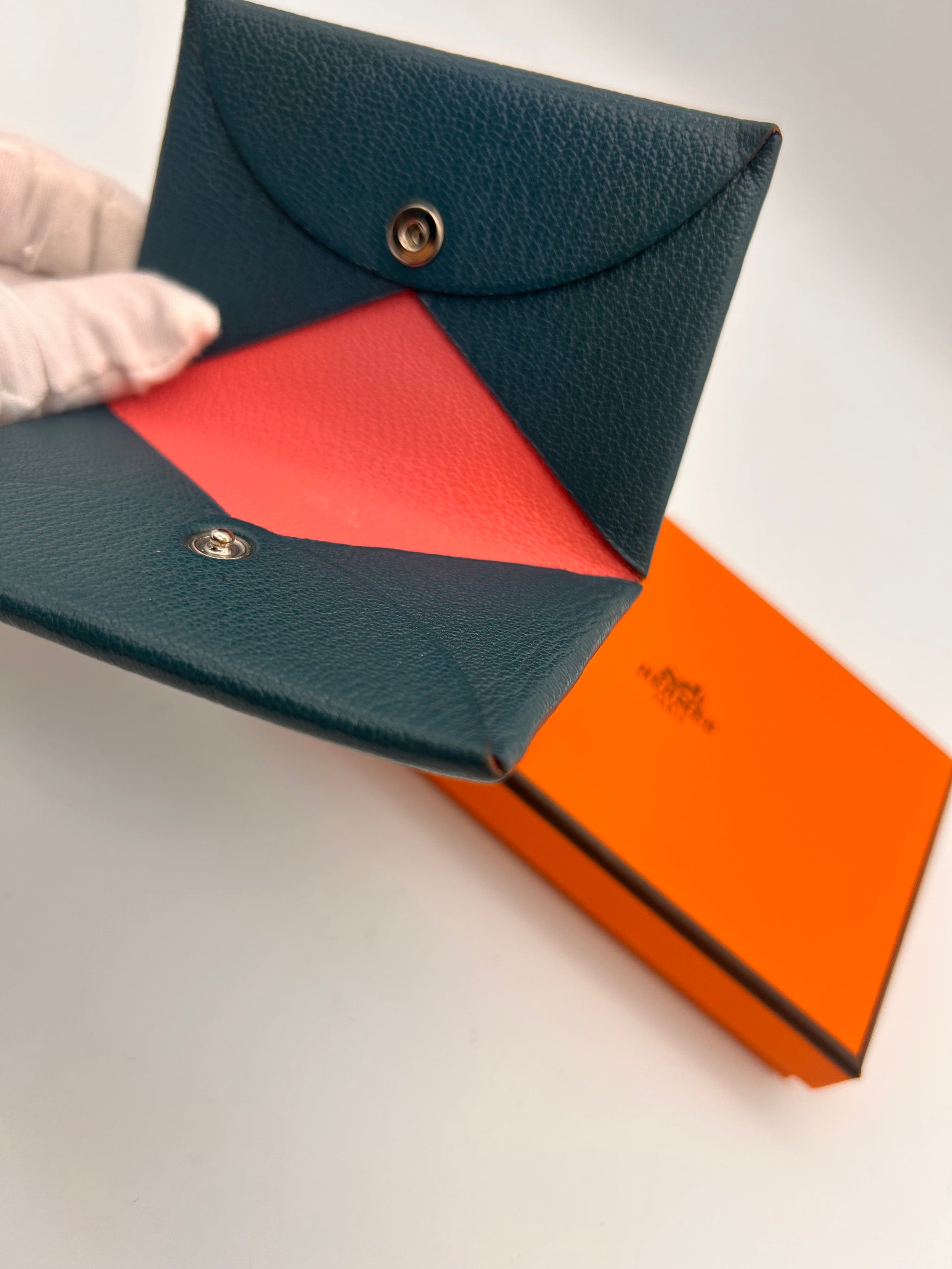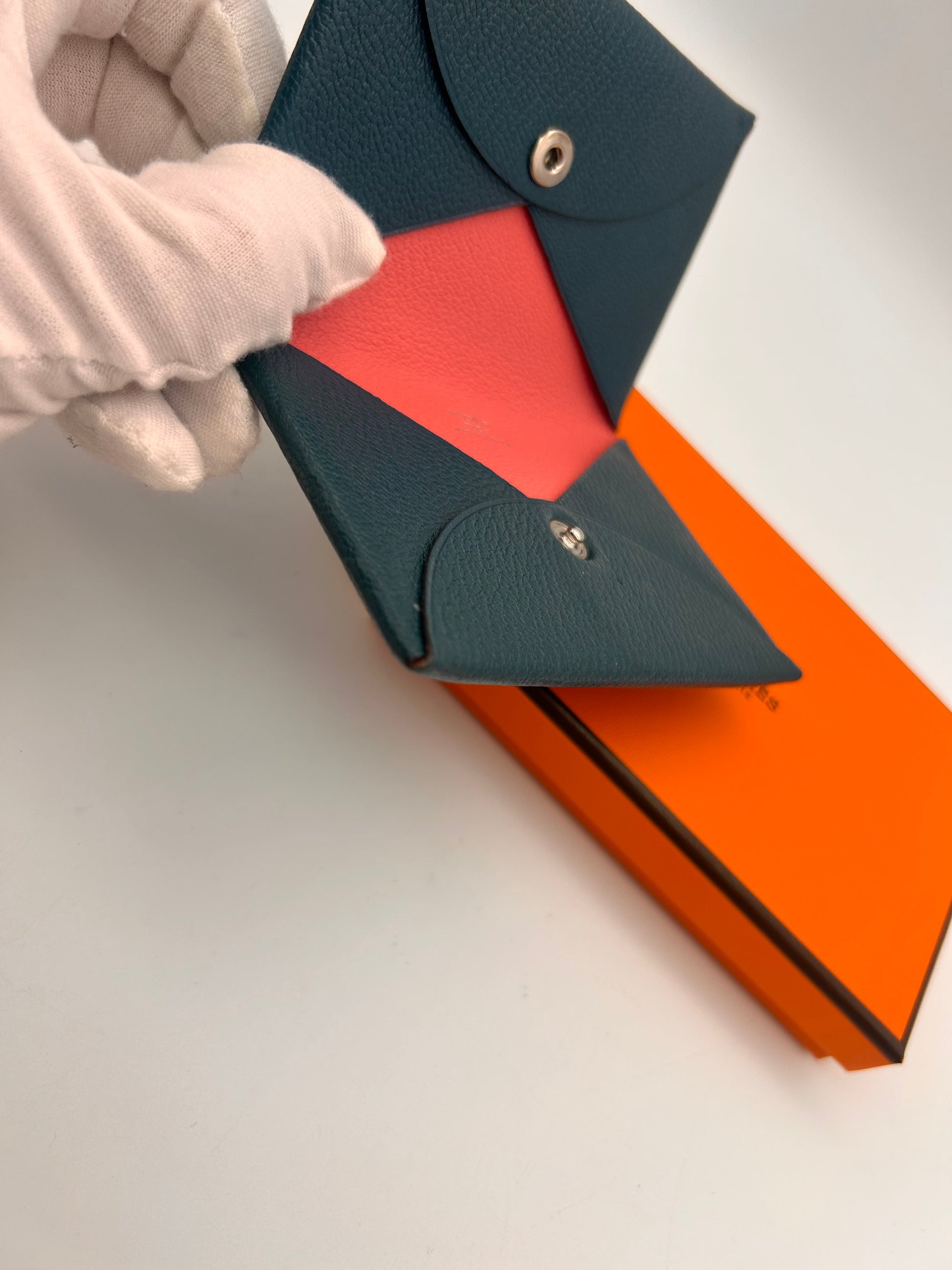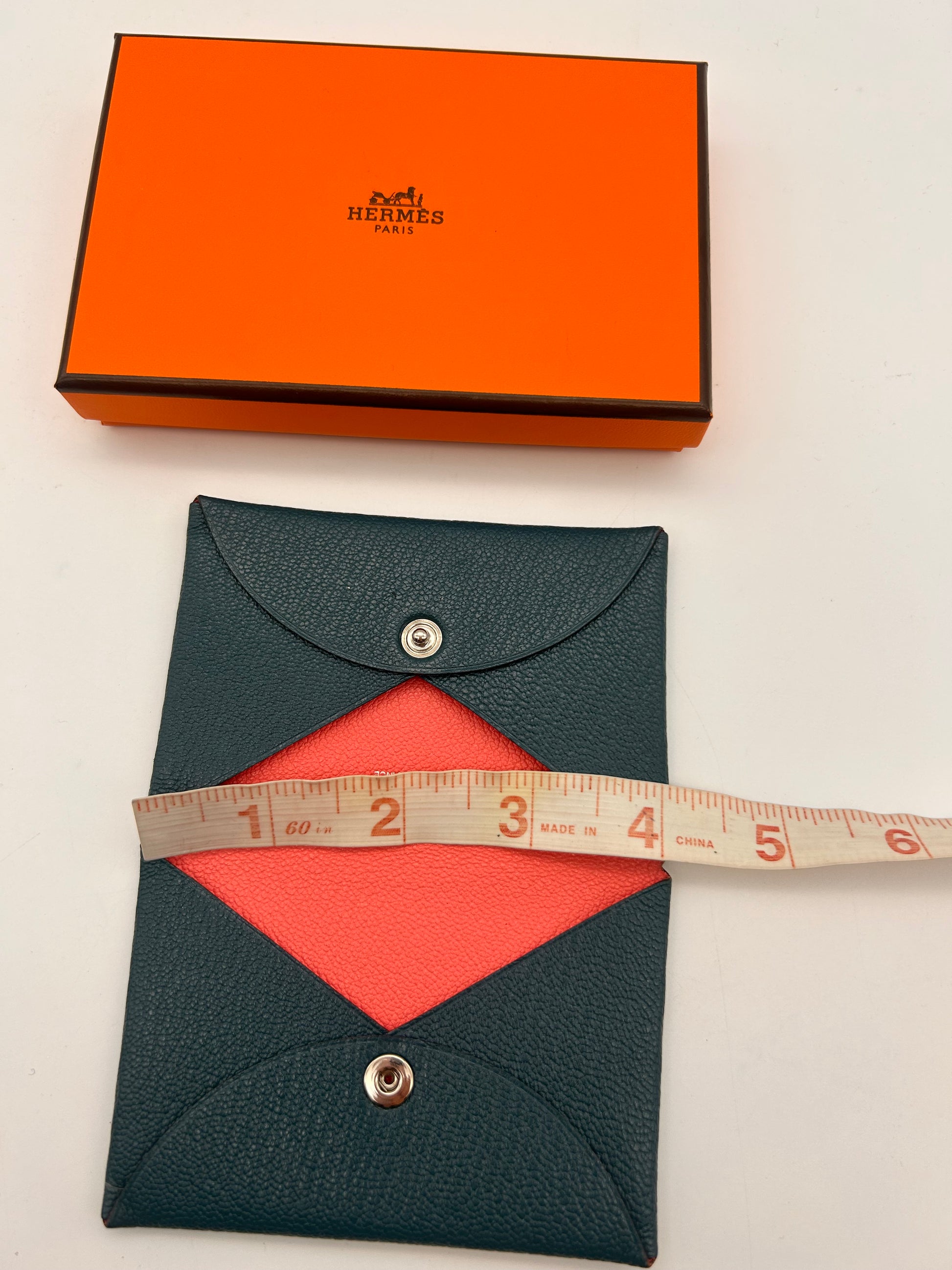 The Hermes Chevre Mysore Calvi case Coin Verso in maybe rose azalee (Pink) inside and vert borphore (bluish green) is a designer wallet for women, featuring a solid multicolor leather material with logo accents. Made in France by the luxury brand HERMÈS, this folding wallet is both stylish and functional, perfect for adding a touch of elegance to any outfit. The wallet comes with its original box, adding to its appeal as a chic and high-quality accessory. Hermes Calvi Verso bicolor Rose azalee and vert bosphore D stamp 2019 Look at photos. Outside has an imperfection across the corner Comes with box Measurements 4” wide 5.5” long when open |