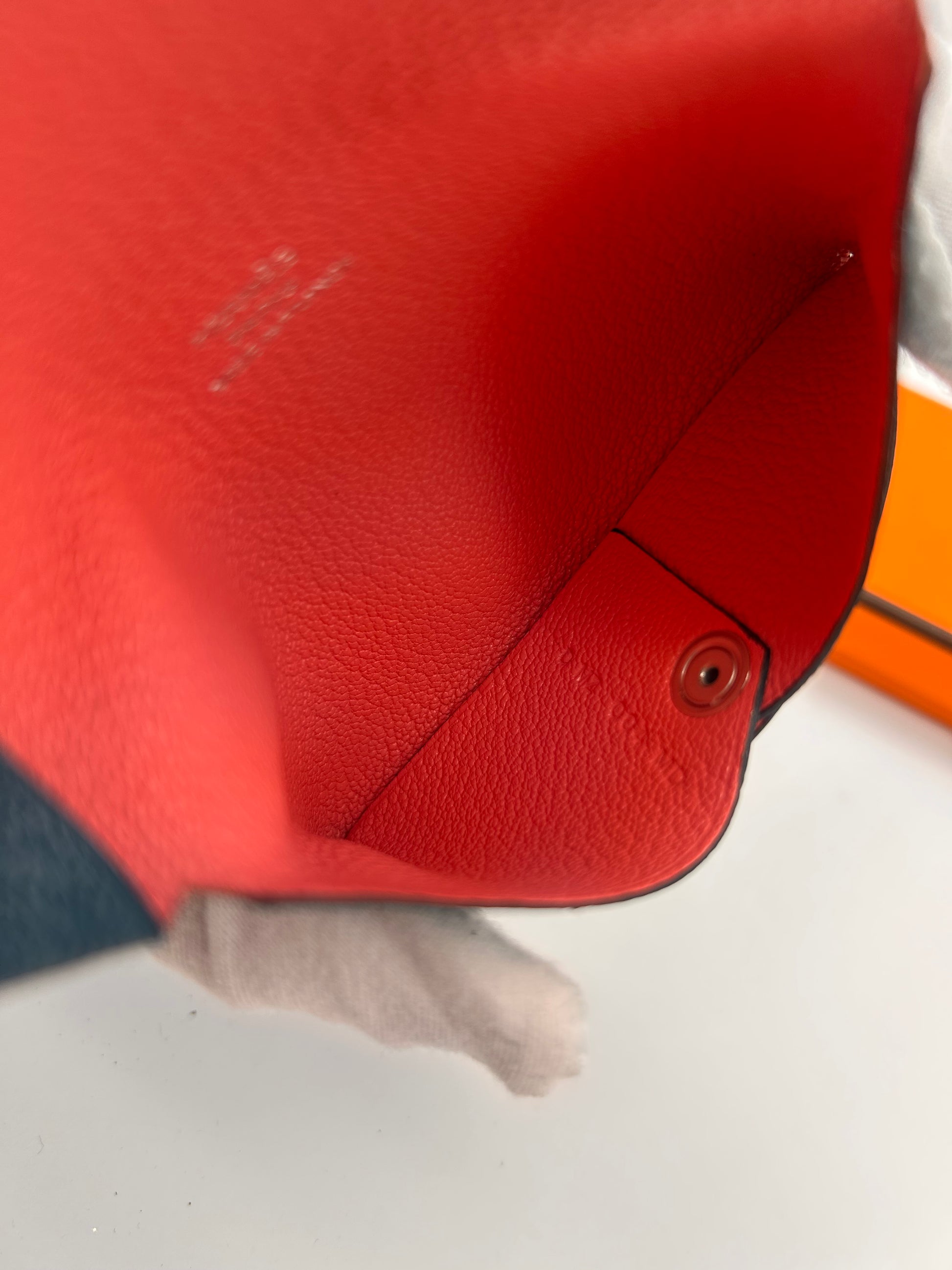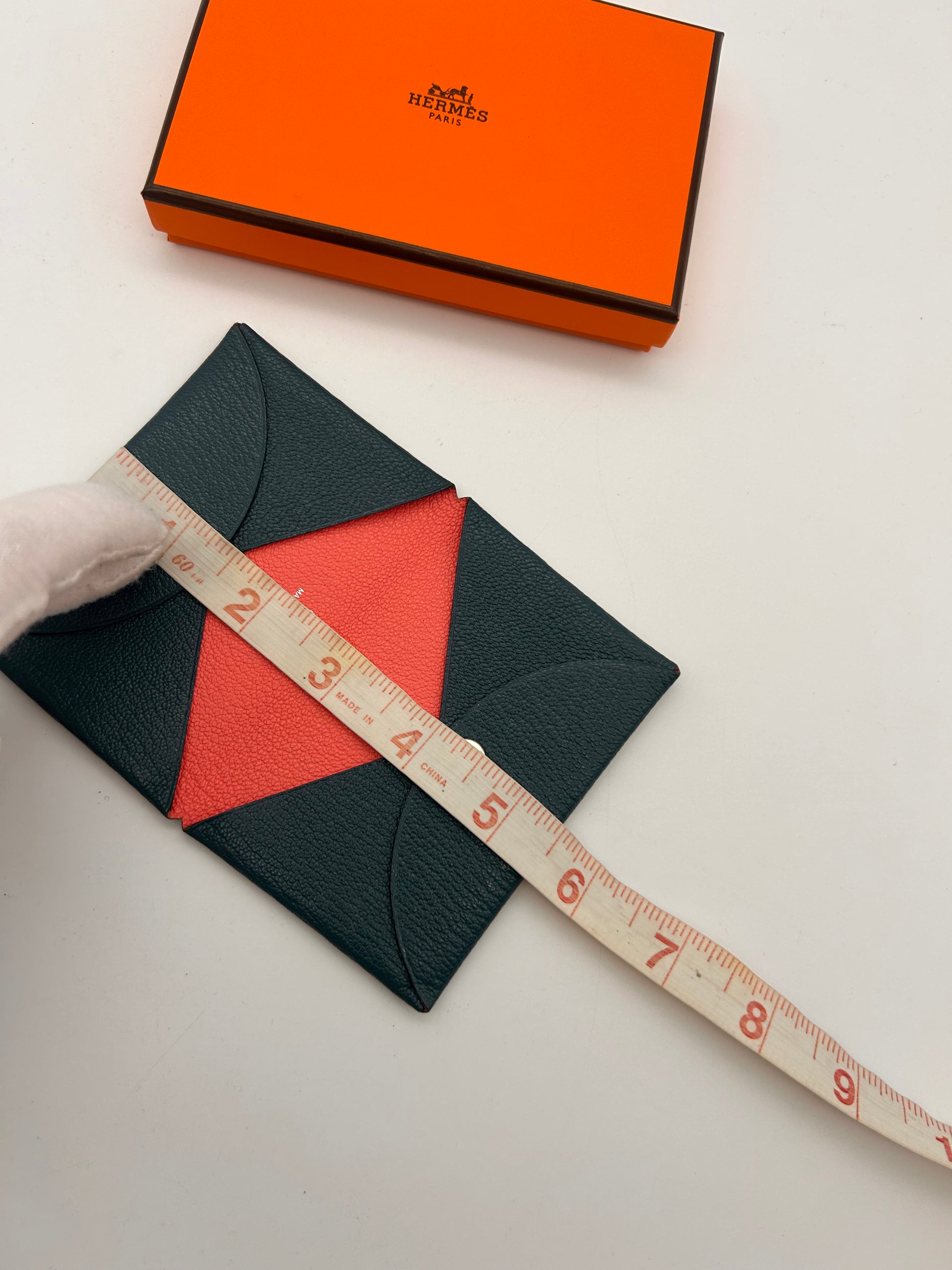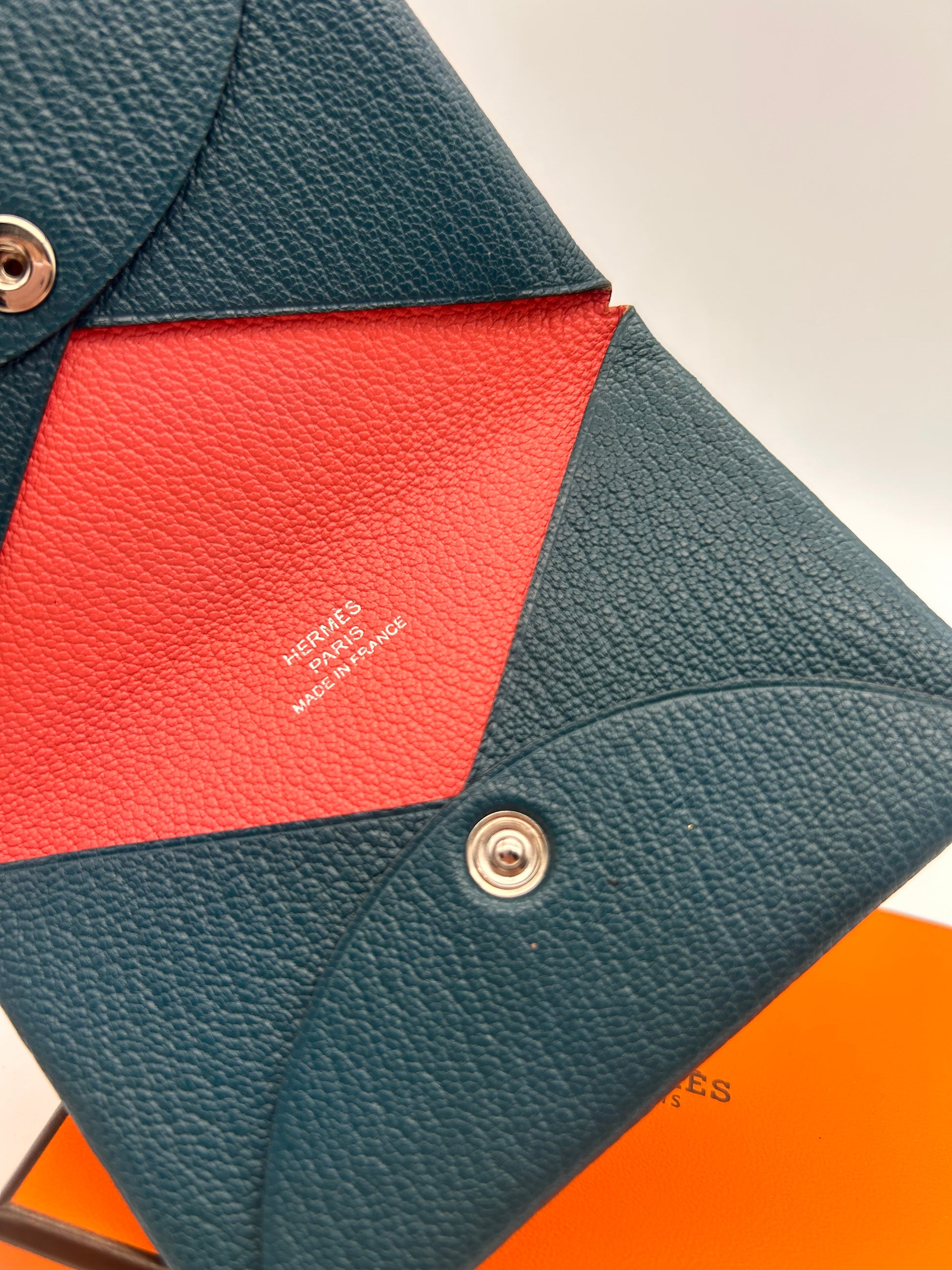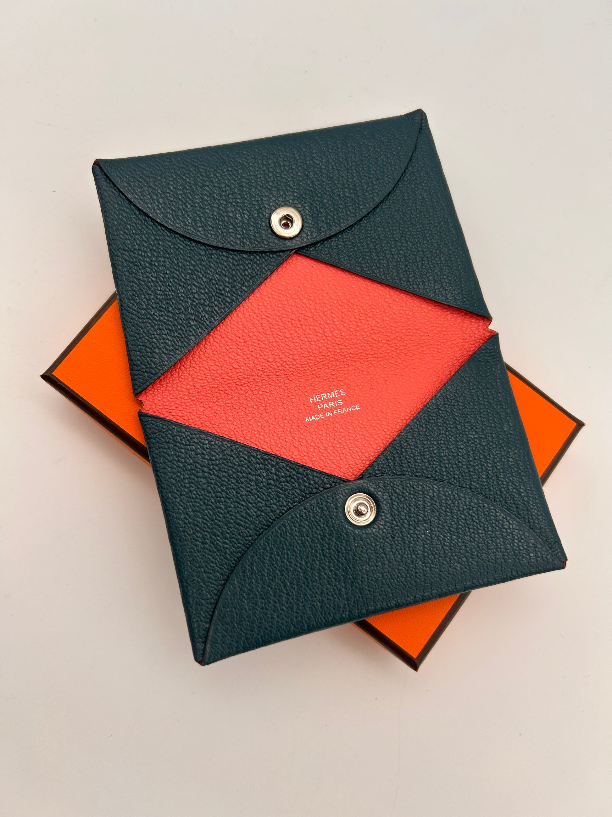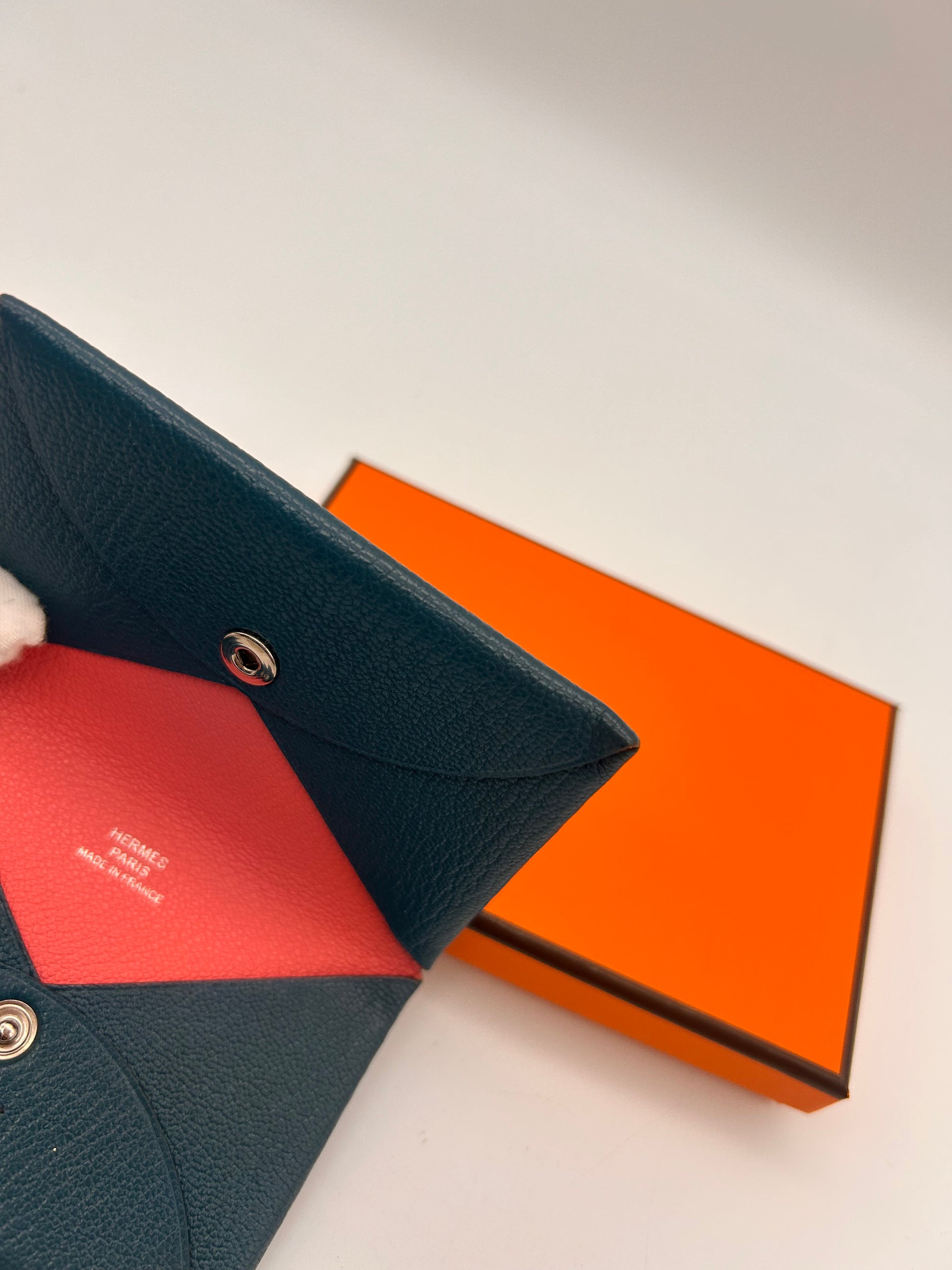 The Hermes Chevre Mysore Calvi case Coin Verso in maybe rose azalee (Pink) inside and vert borphore (bluish green) is a designer wallet for women, featuring a solid multicolor leather material with logo accents. Made in France by the luxury brand HERMÈS, this folding wallet is both stylish and functional, perfect for adding a touch of elegance to any outfit. The wallet comes with its original box, adding to its appeal as a chic and high-quality accessory. Hermes Calvi Verso bicolor Rose azalee and vert bosphore D stamp 2019 Look at photos. Outside has an imperfection across the corner Comes with box Measurements 4” wide 5.5” long when open |