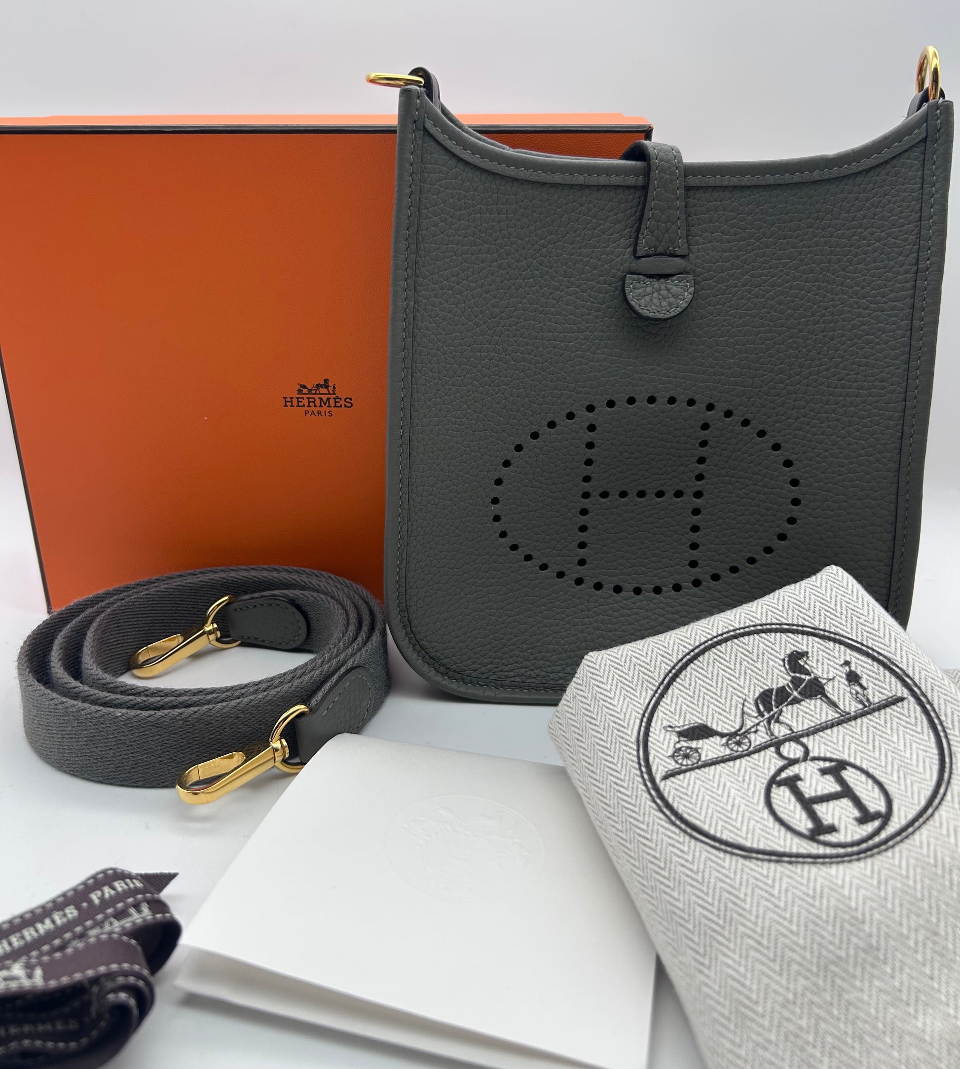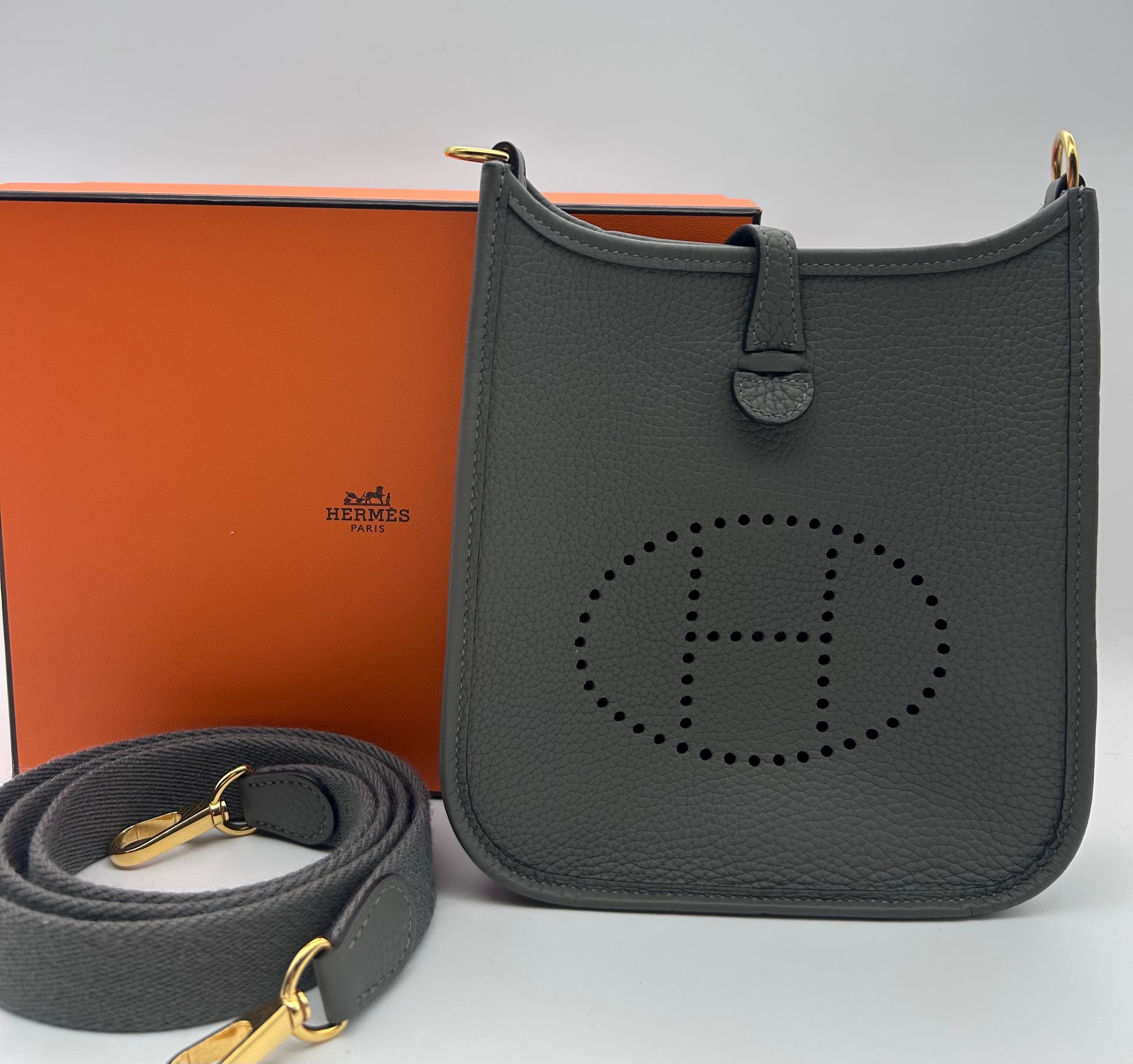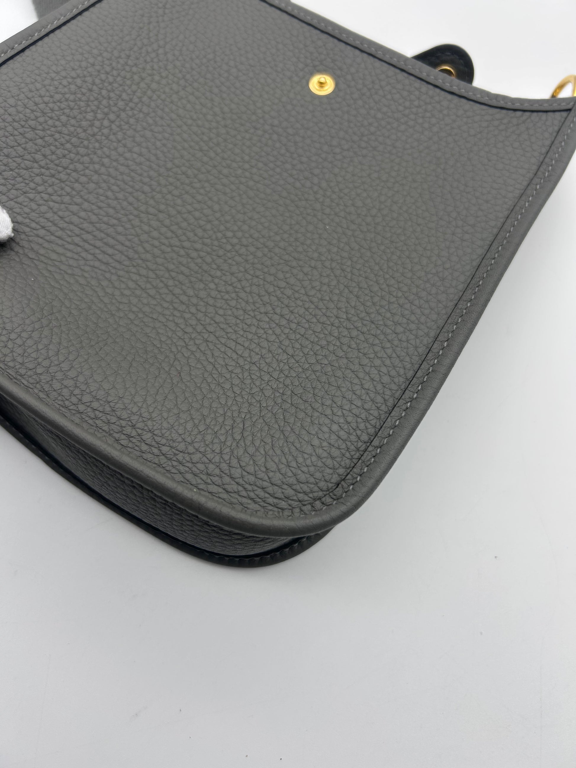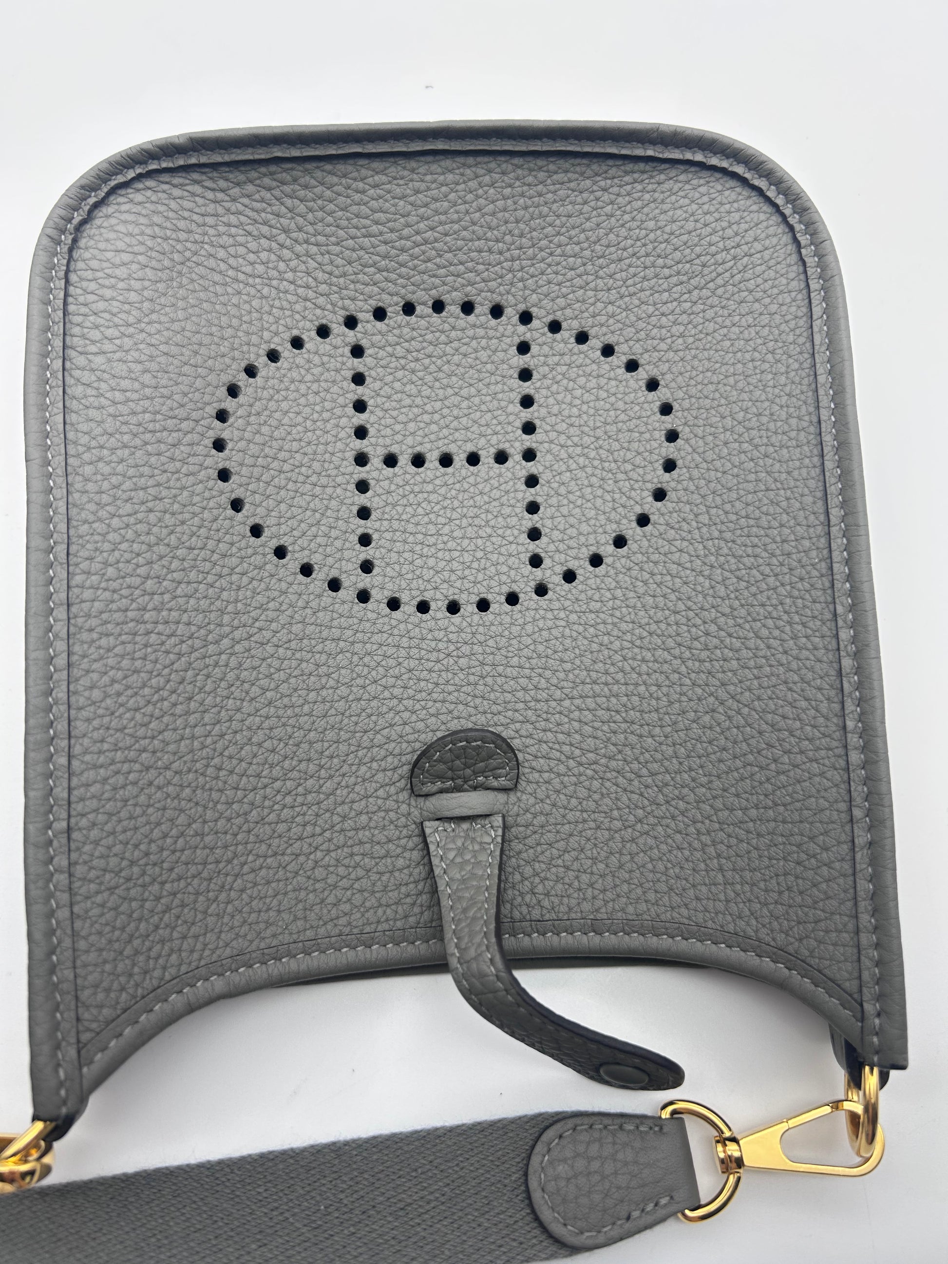 The HERMES Mini Evelyne TPM in Gris Meyer Calfskin Leather with Gold Hardware is a stylish and chic crossbody bag designed for the fashion-forward woman. With a square shape and a mini size, this bag is perfect for travel and casual occasions. Made with high-quality HERMÈS Clemence leather and featuring a grained texture, this bag exudes luxury and sophistication. The black crossbody strap adds a touch of versatility, while the gold hardware adds a touch of glamour. This elegant bag comes with a detachable strap, original box, and original dust bag, making it a must-have accessory for any fashion-conscious woman. Full set mini Evelyne 16 TPM Comes with box dustbags and receipt Gris Meyer rare color combo with gold hardware Good condition K stamp 2025 |