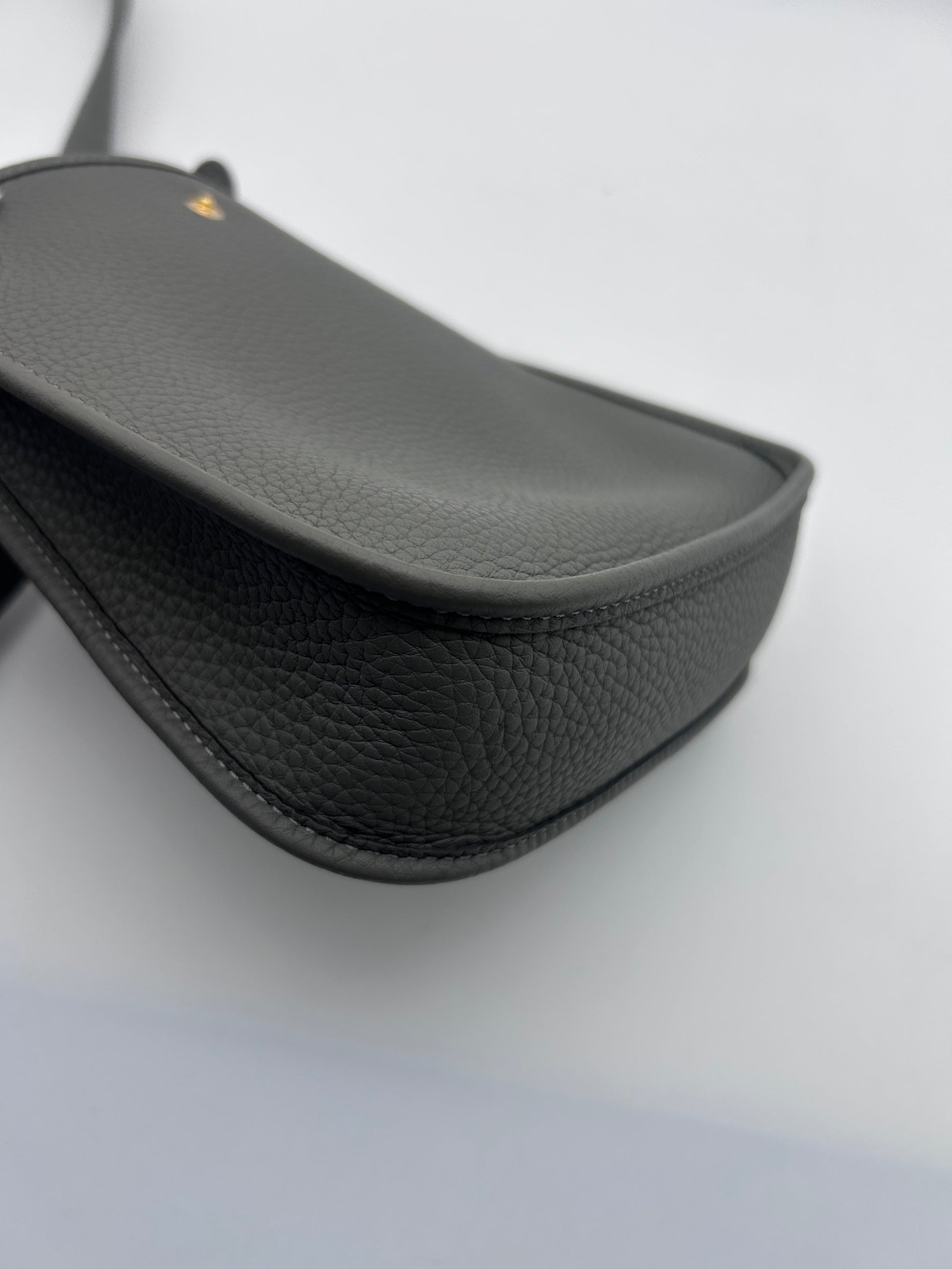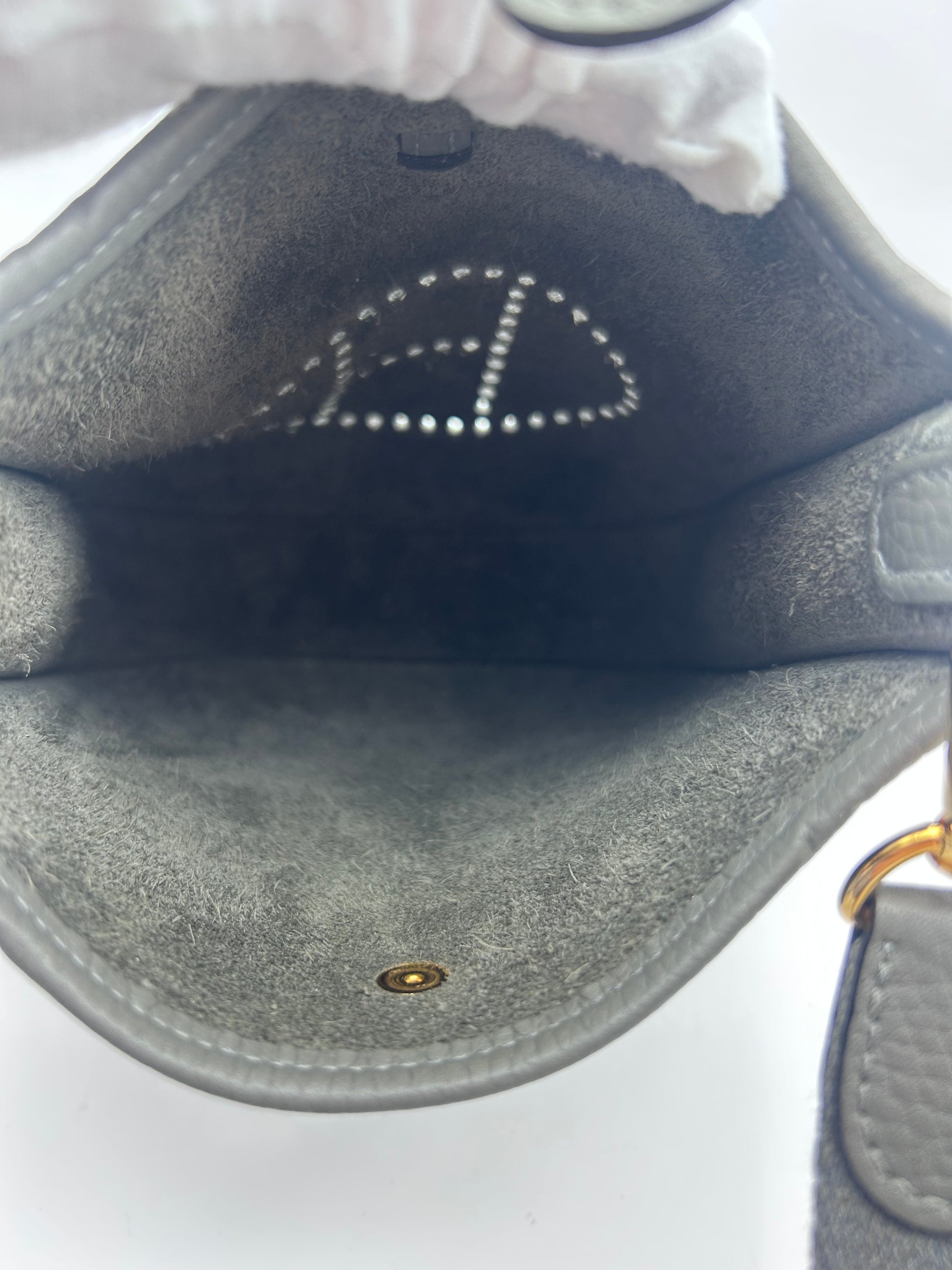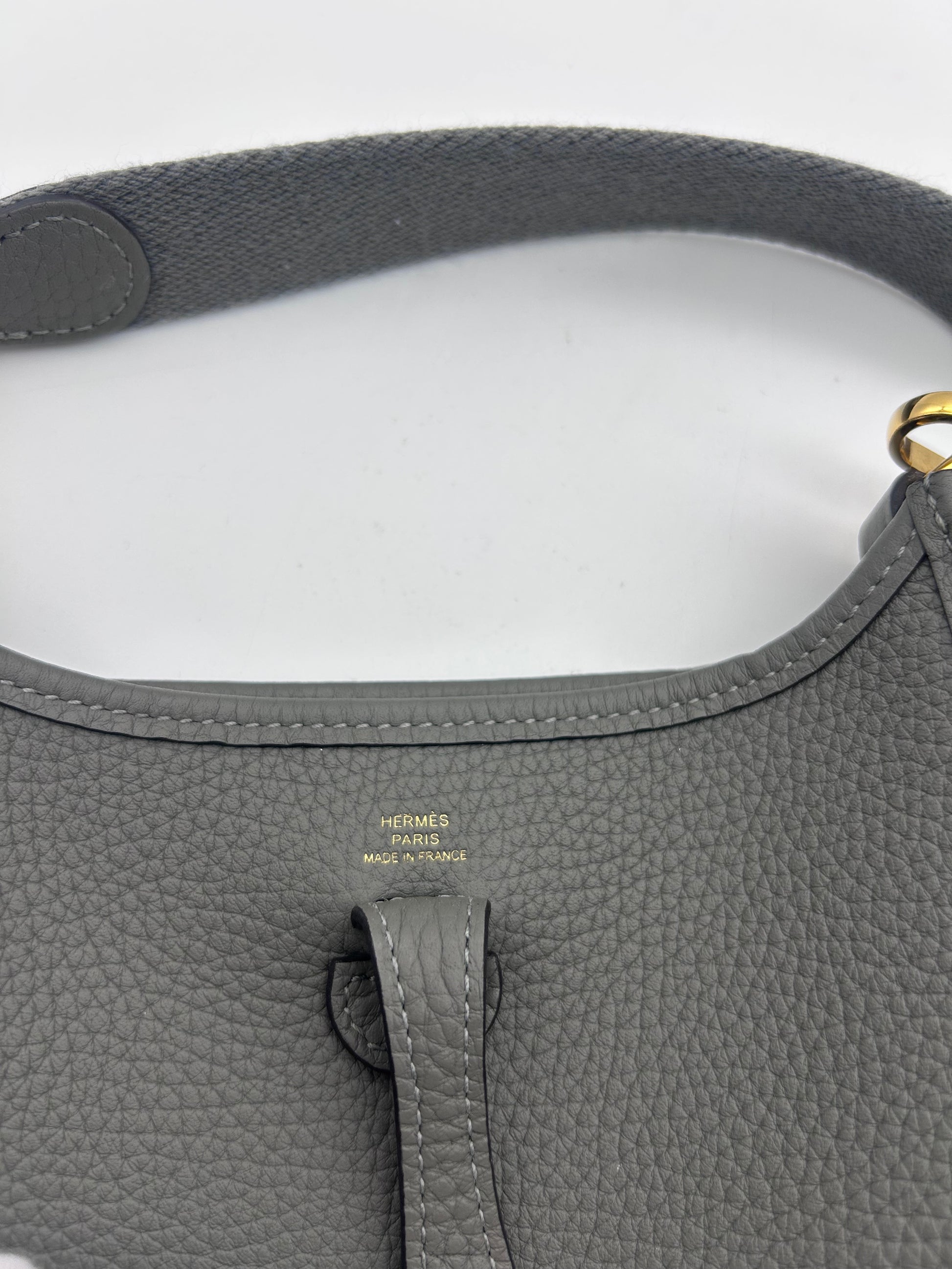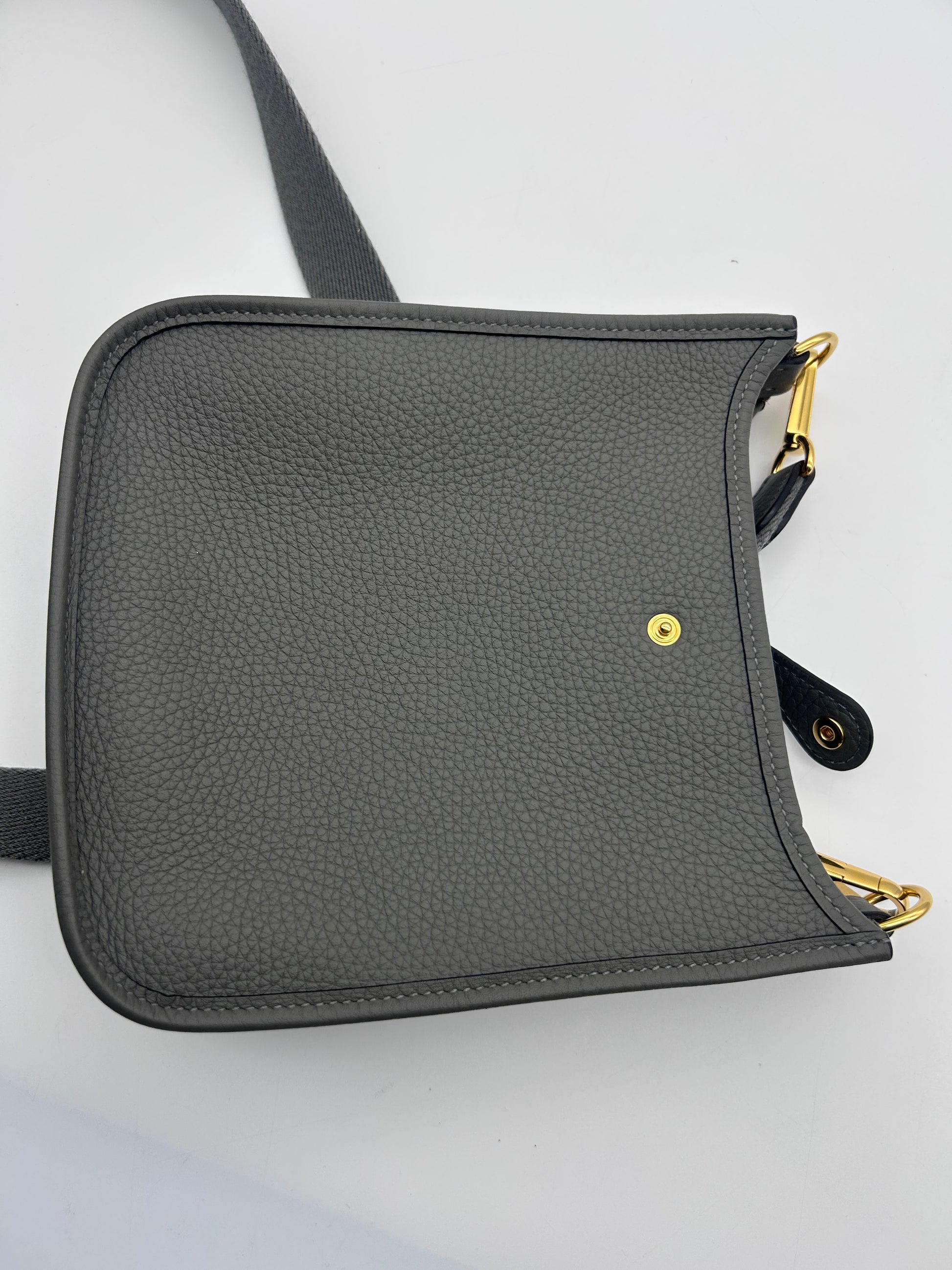 The HERMES Mini Evelyne TPM in Gris Meyer Calfskin Leather with Gold Hardware is a stylish and chic crossbody bag designed for the fashion-forward woman. With a square shape and a mini size, this bag is perfect for travel and casual occasions. Made with high-quality HERMÈS Clemence leather and featuring a grained texture, this bag exudes luxury and sophistication. The black crossbody strap adds a touch of versatility, while the gold hardware adds a touch of glamour. This elegant bag comes with a detachable strap, original box, and original dust bag, making it a must-have accessory for any fashion-conscious woman. Full set mini Evelyne 16 TPM Comes with box dustbags and receipt Gris Meyer rare color combo with gold hardware Good condition K stamp 2025 |
