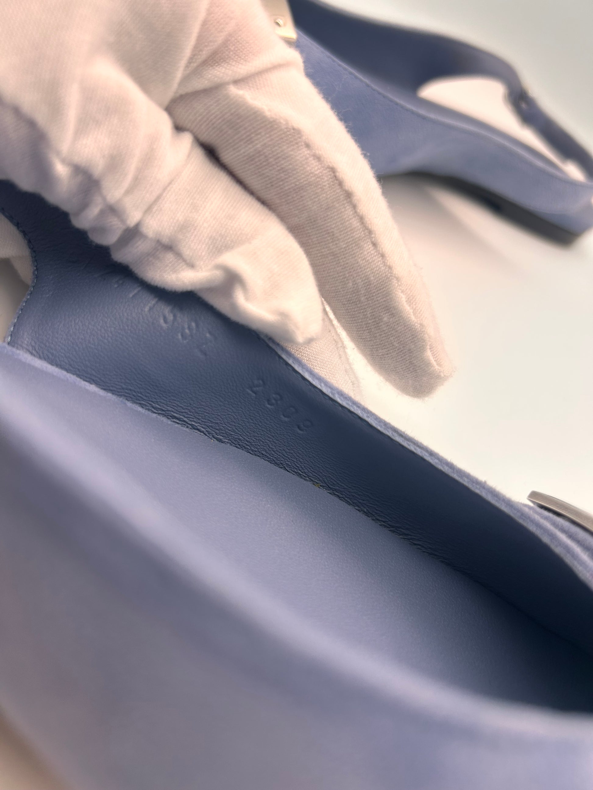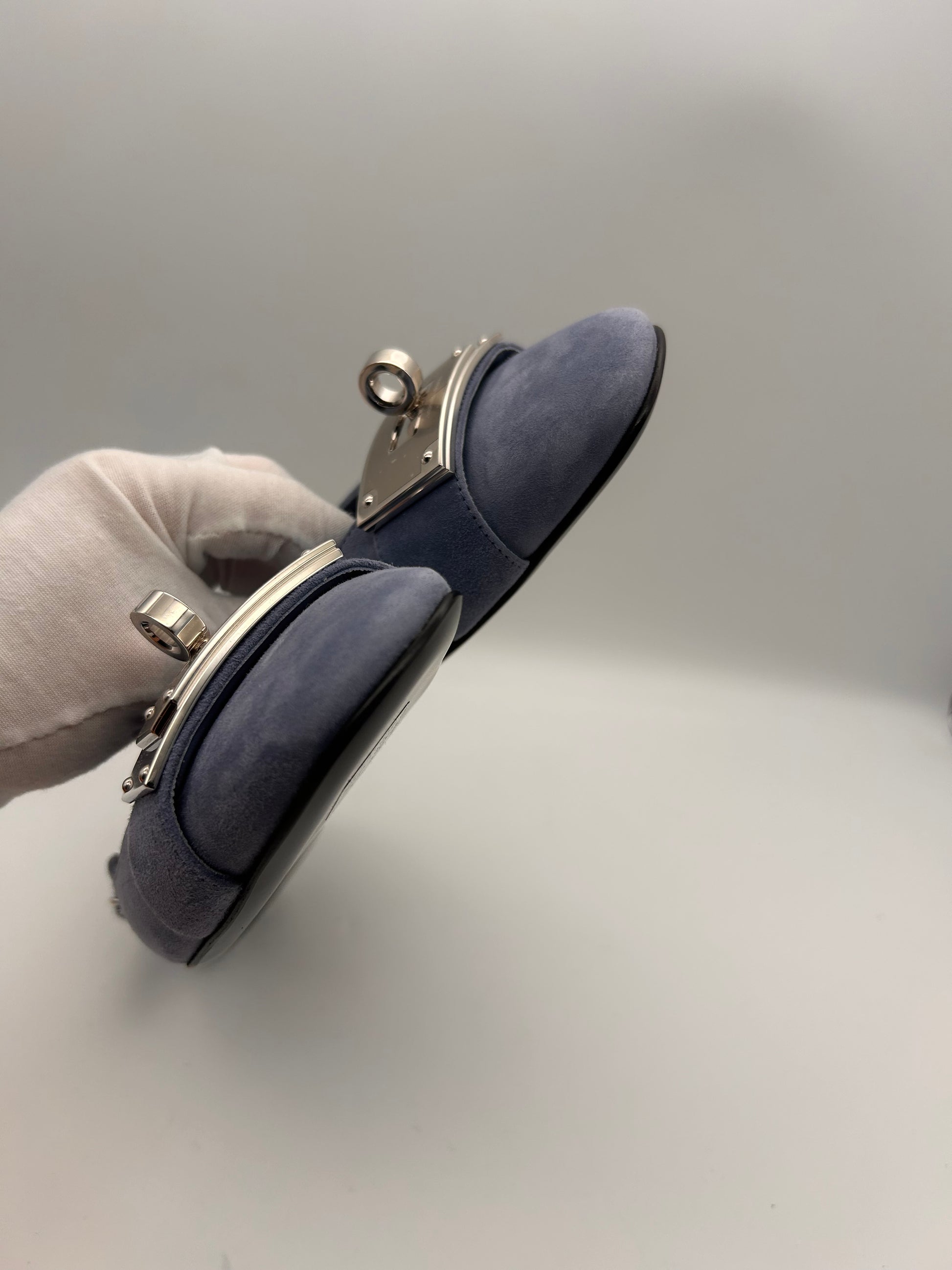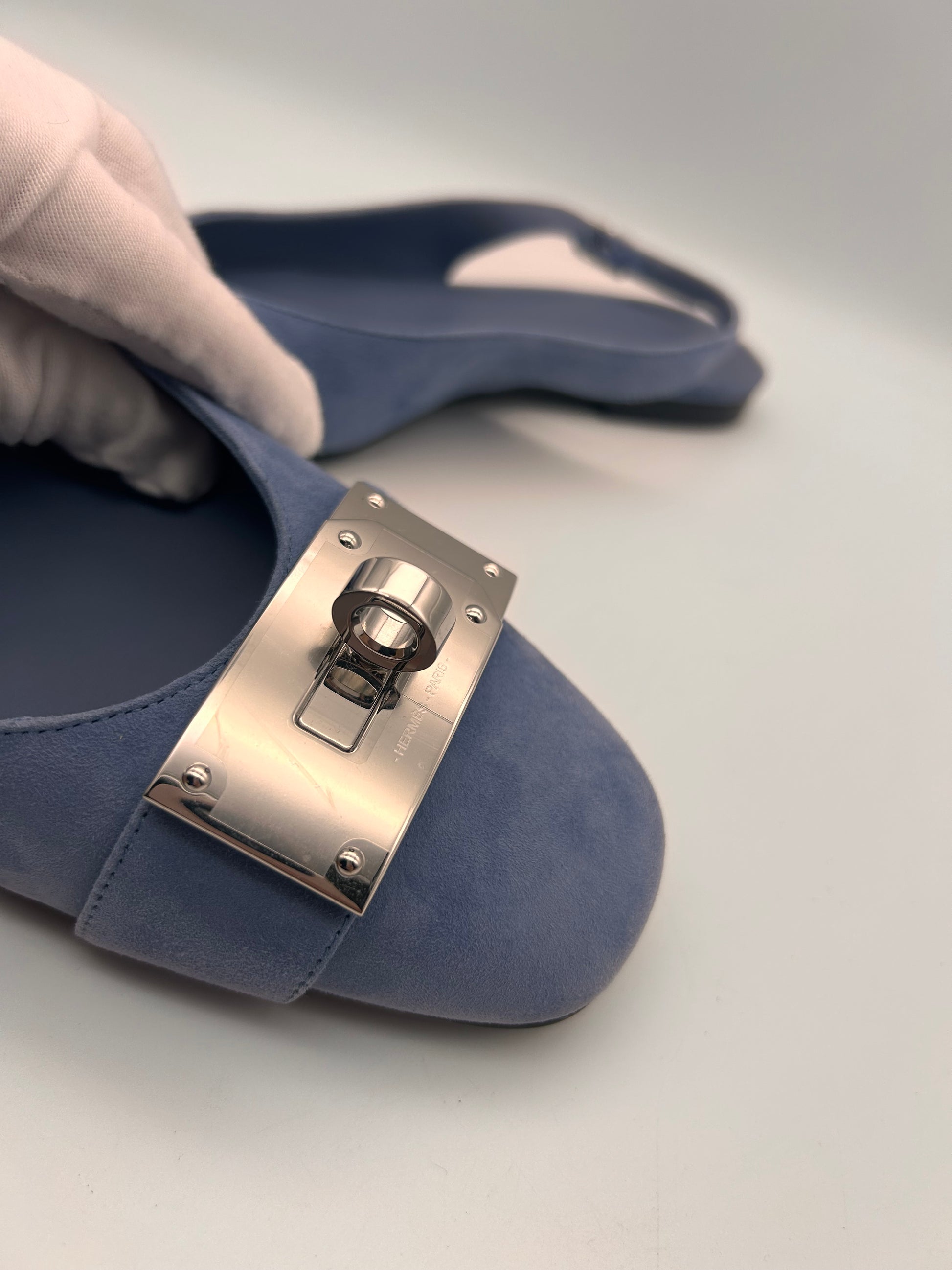 Blue suede with Kelly buckle with stickers attached