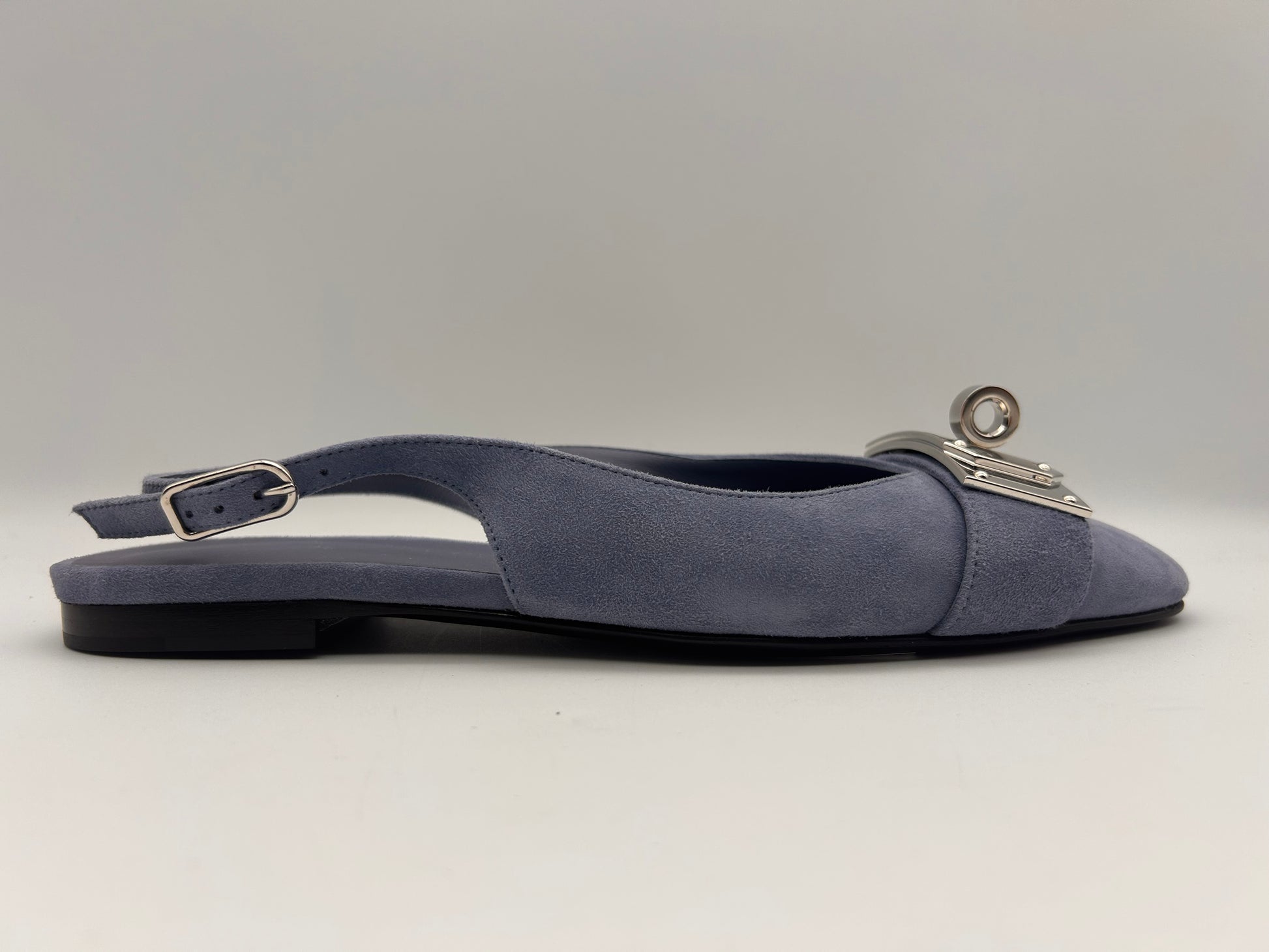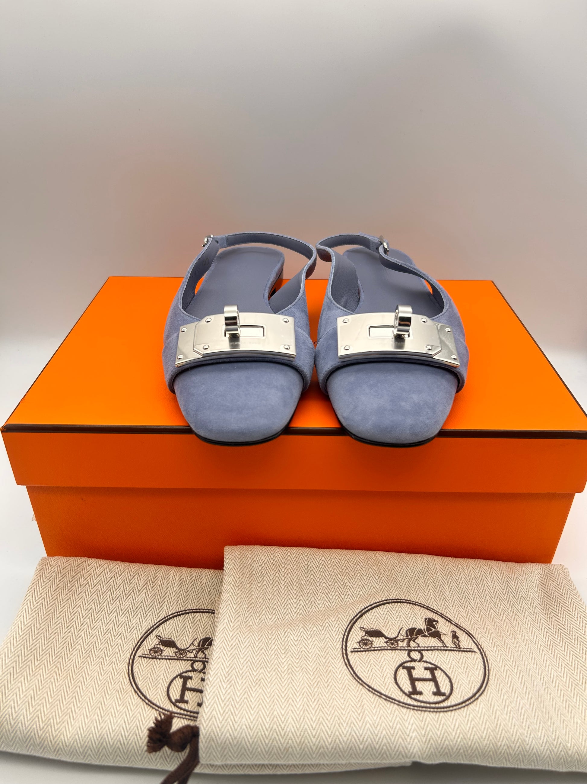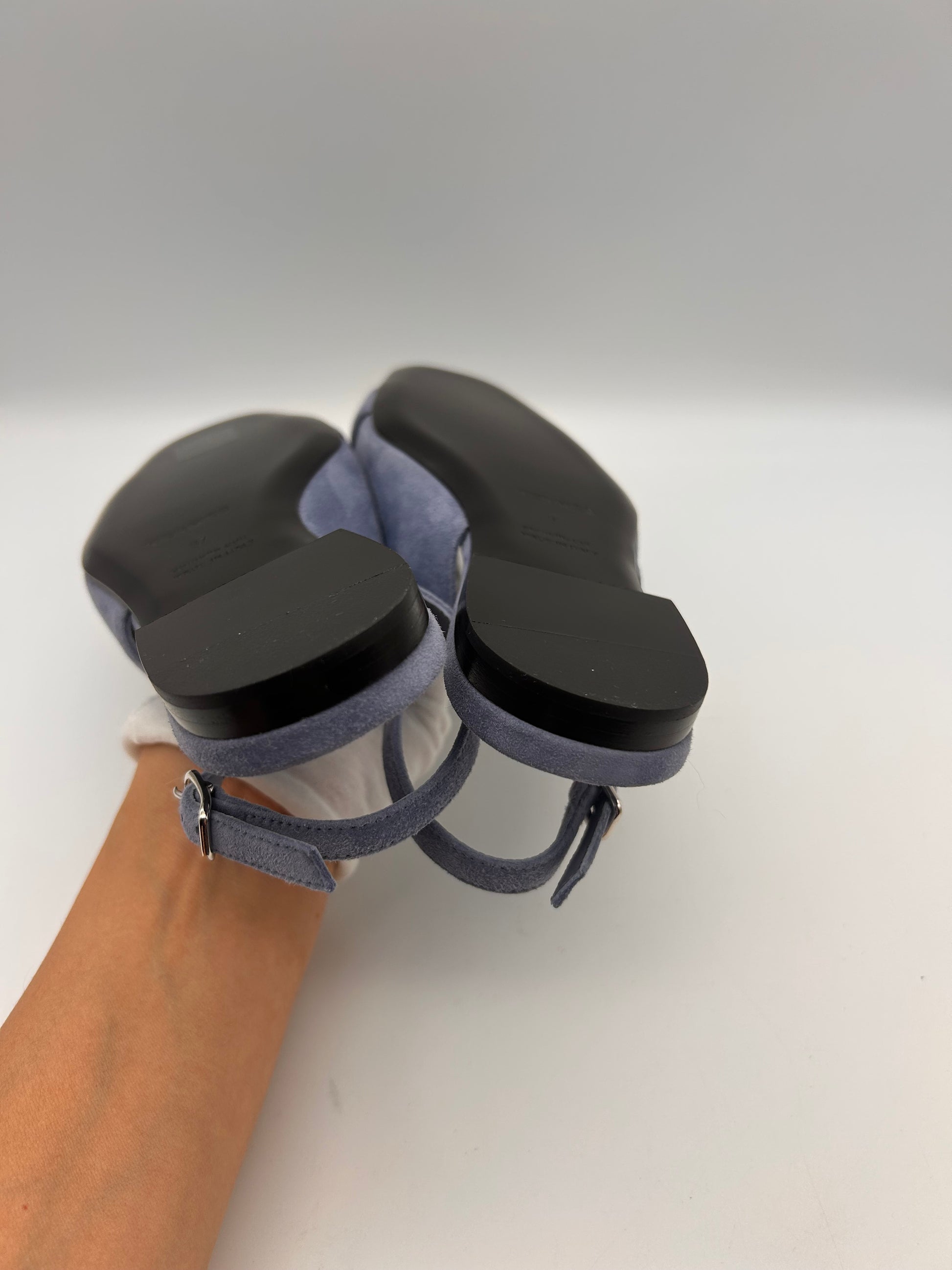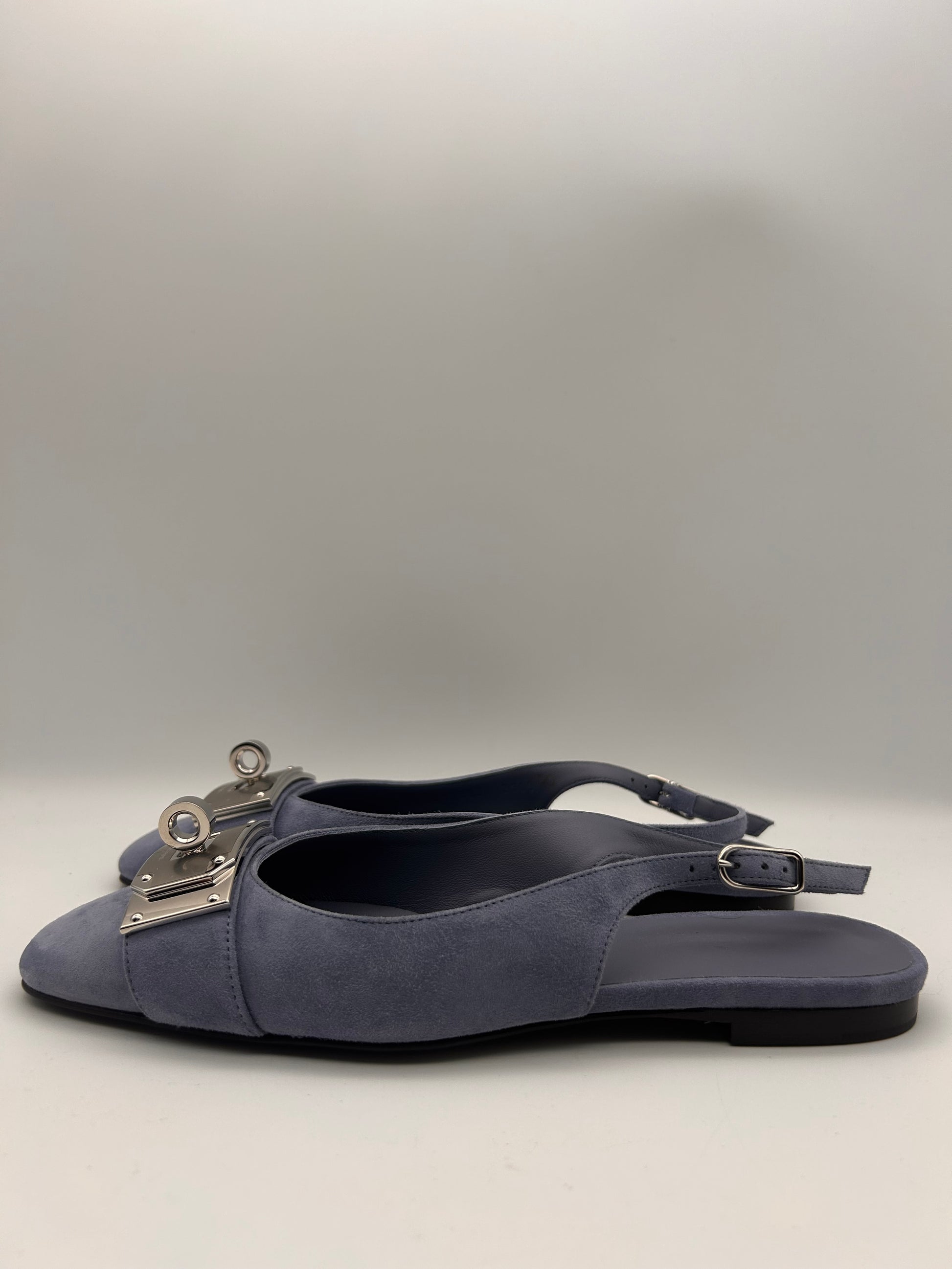 The HERMES Innocente Ballerina Slingback Pumps in Blue Suede Bleu Ciel size 37 are a stylish and classic pair of designer women's shoes. The adjustable slingback strap and buckle detail add a touch of sophistication to these elegant flats. Made of leather with a leather lining and insole, they provide comfort and durability. The timeless design and high-quality craftsmanship make these pumps a versatile addition to any wardrobe.