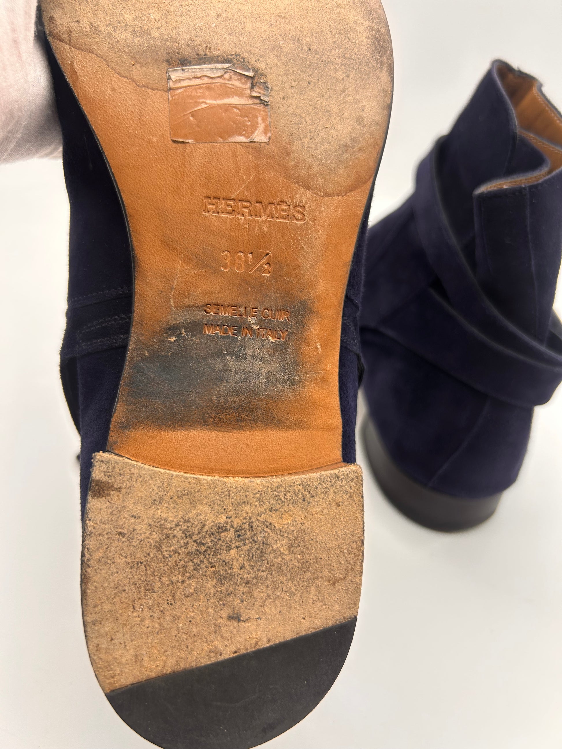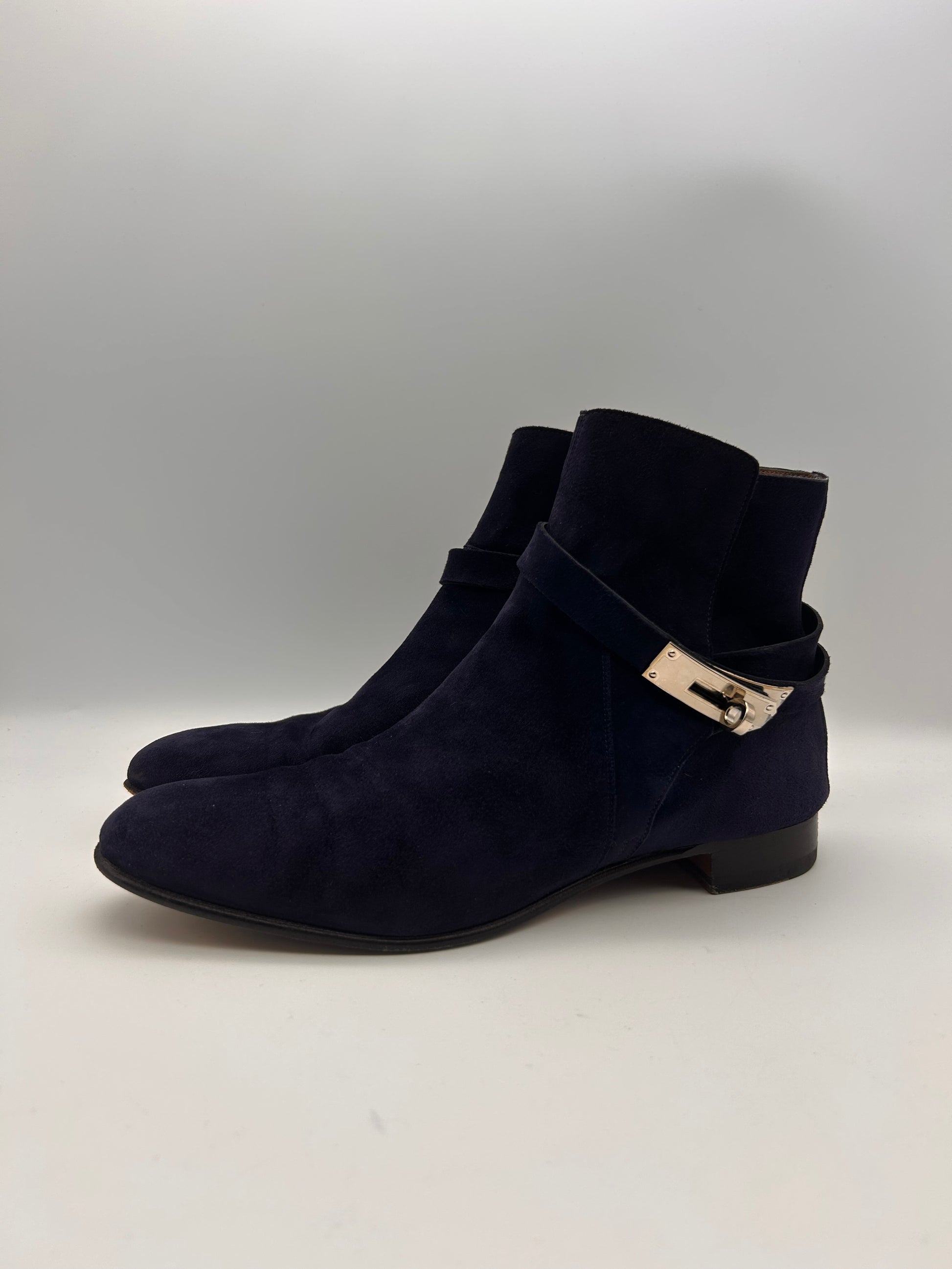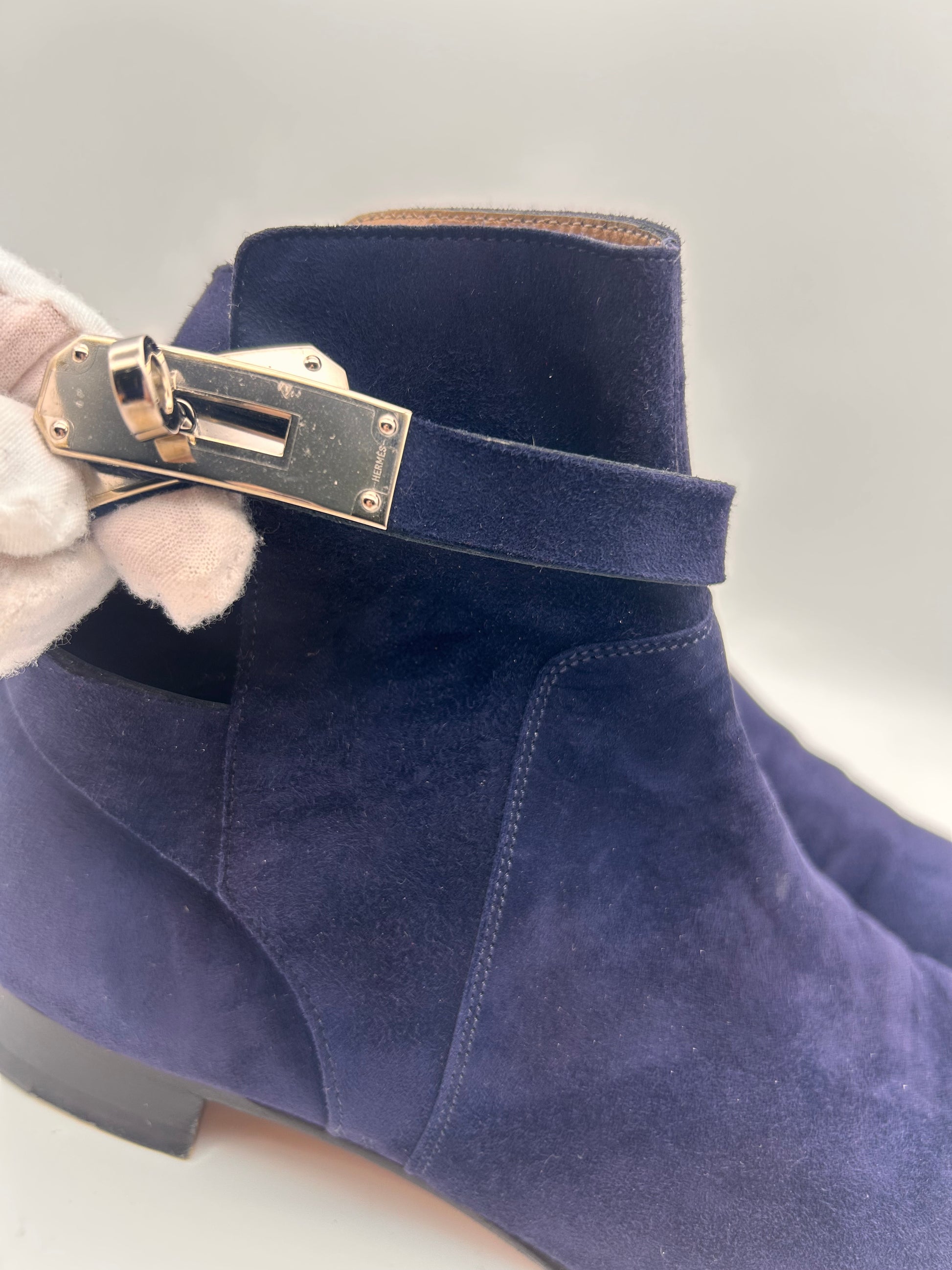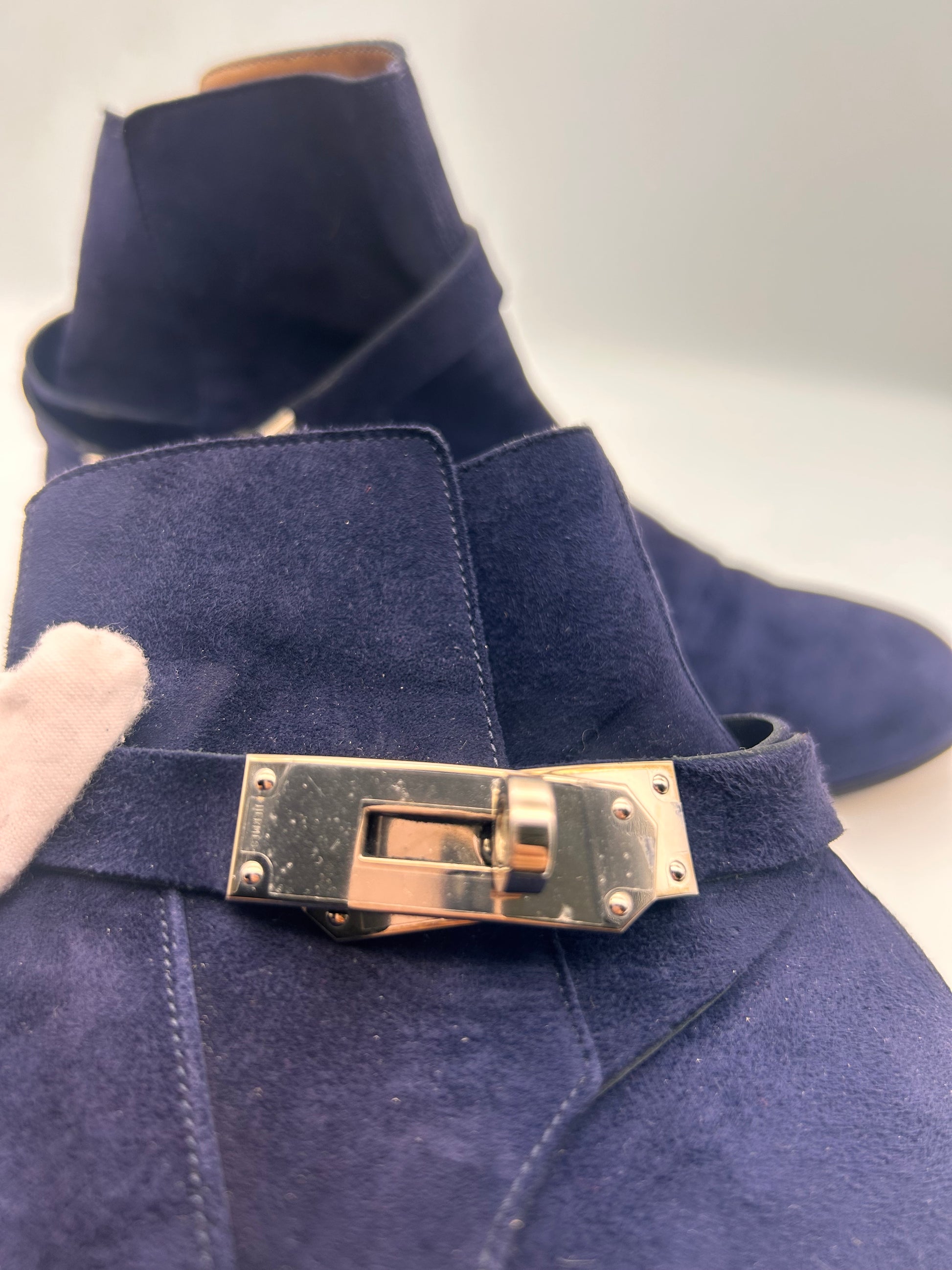 The Hermes Neo Boots in navy suede with palladium hardware are stylish ankle boots designed for women. Featuring a round toe and low heel, these designer boots are accented with crochet details and embody an equestrian theme. Made in Italy with leather lining and upper material, the boots offer a standard shoe width and are perfect for adding a touch of luxury to any outfit. The boots are in size 38.5 (US 8) and do not come with a box or dustbag. Size 38.5 Color is a navy suede Good used condition Please inspect all photos Hardware still has stickers on it No box No dustbags |