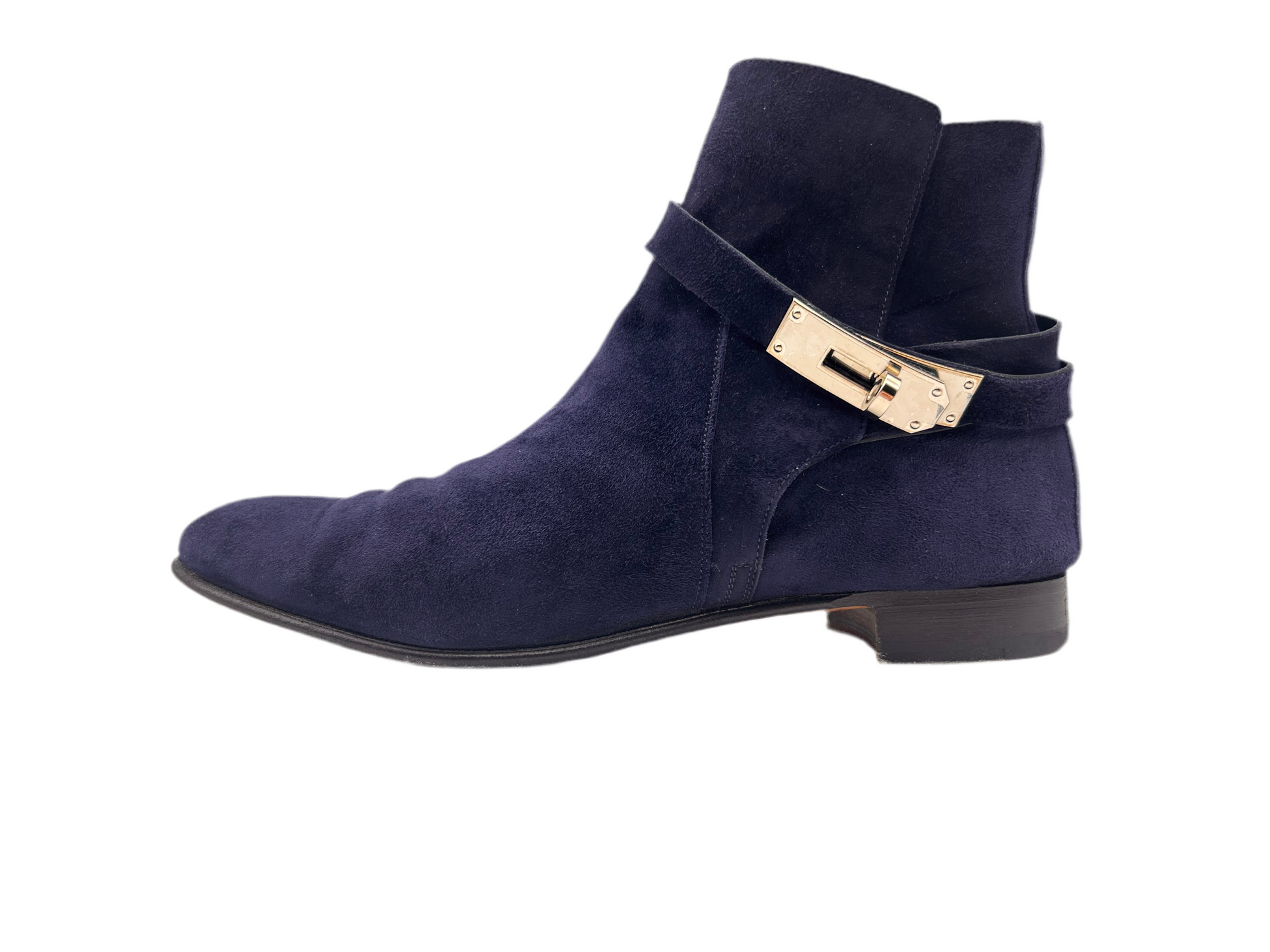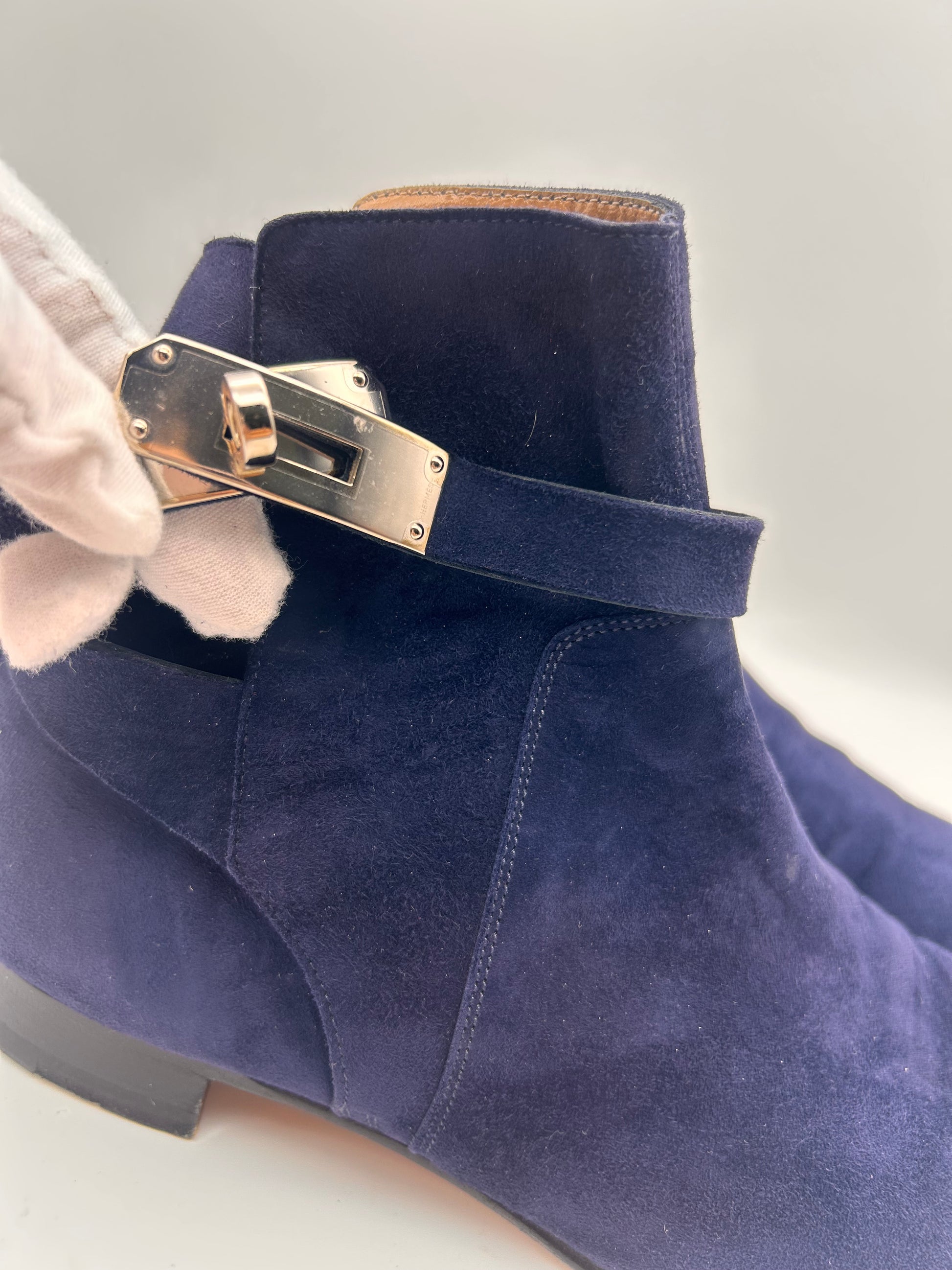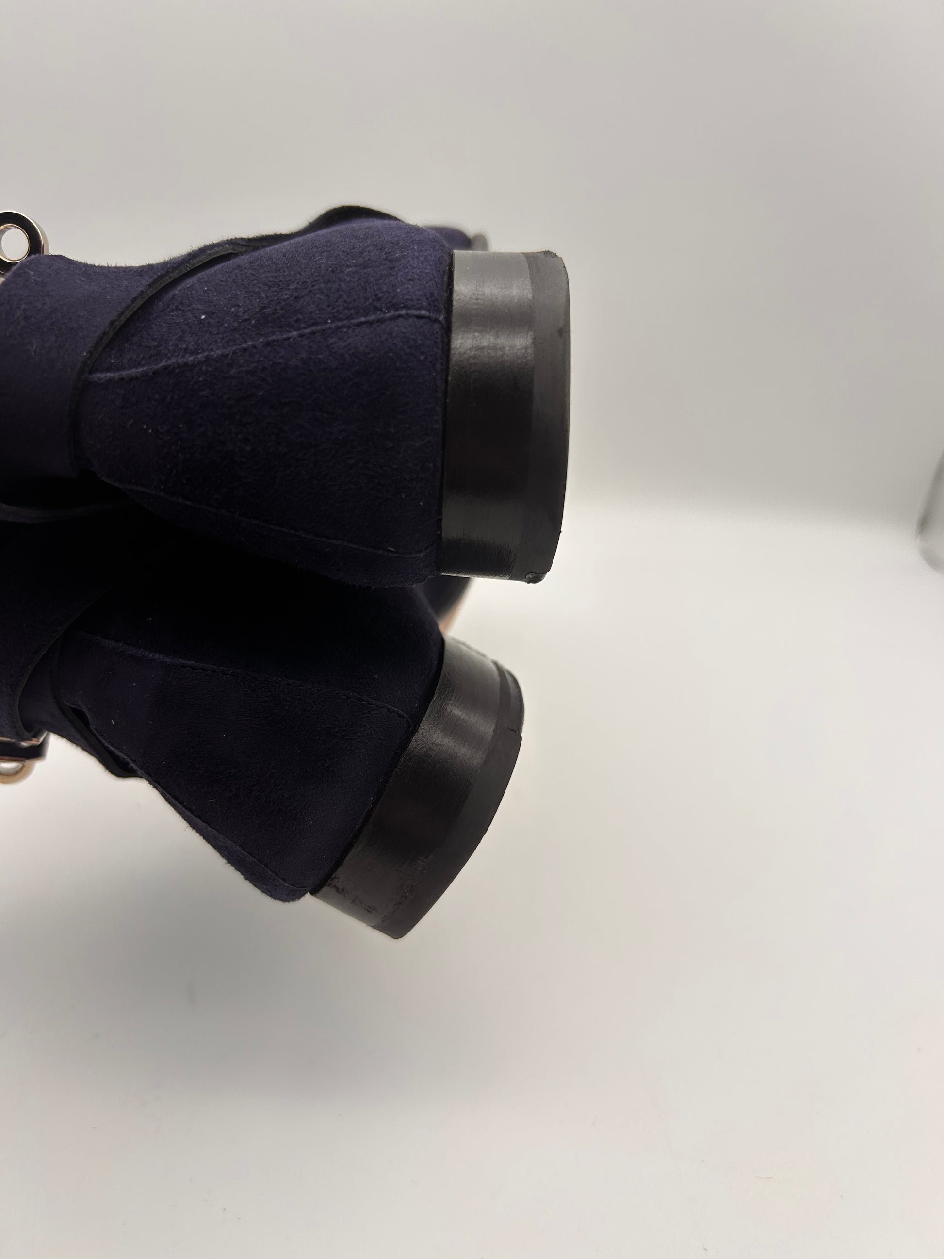 The Hermes Neo Boots in navy suede with palladium hardware are stylish ankle boots designed for women. Featuring a round toe and low heel, these designer boots are accented with crochet details and embody an equestrian theme. Made in Italy with leather lining and upper material, the boots offer a standard shoe width and are perfect for adding a touch of luxury to any outfit. The boots are in size 38.5 (US 8) and do not come with a box or dustbag. Size 38.5 Color is a navy suede Good used condition Please inspect all photos Hardware still has stickers on it No box No dustbags |