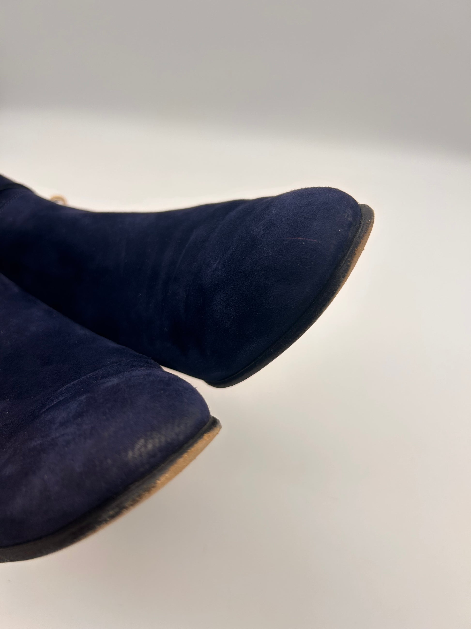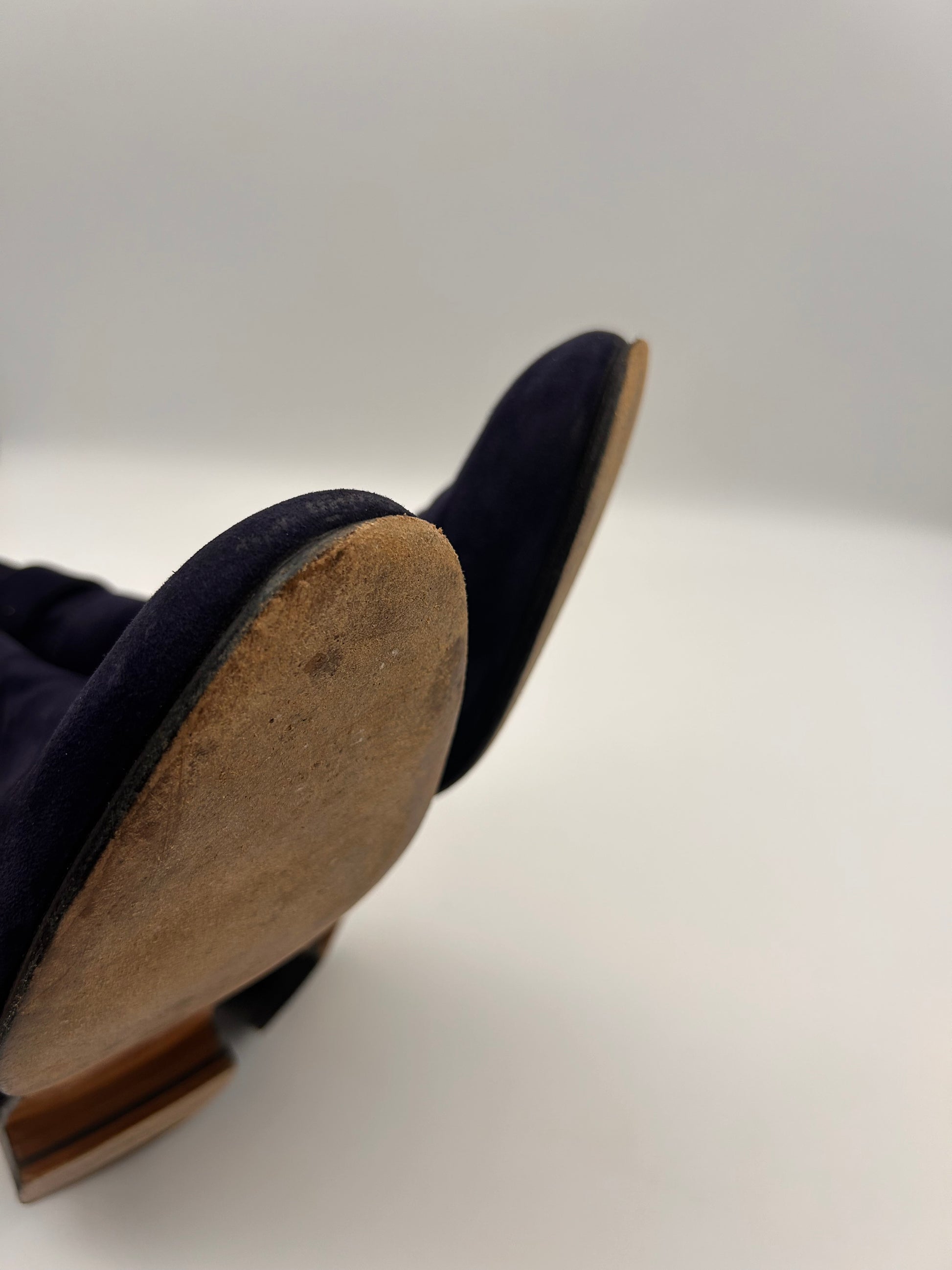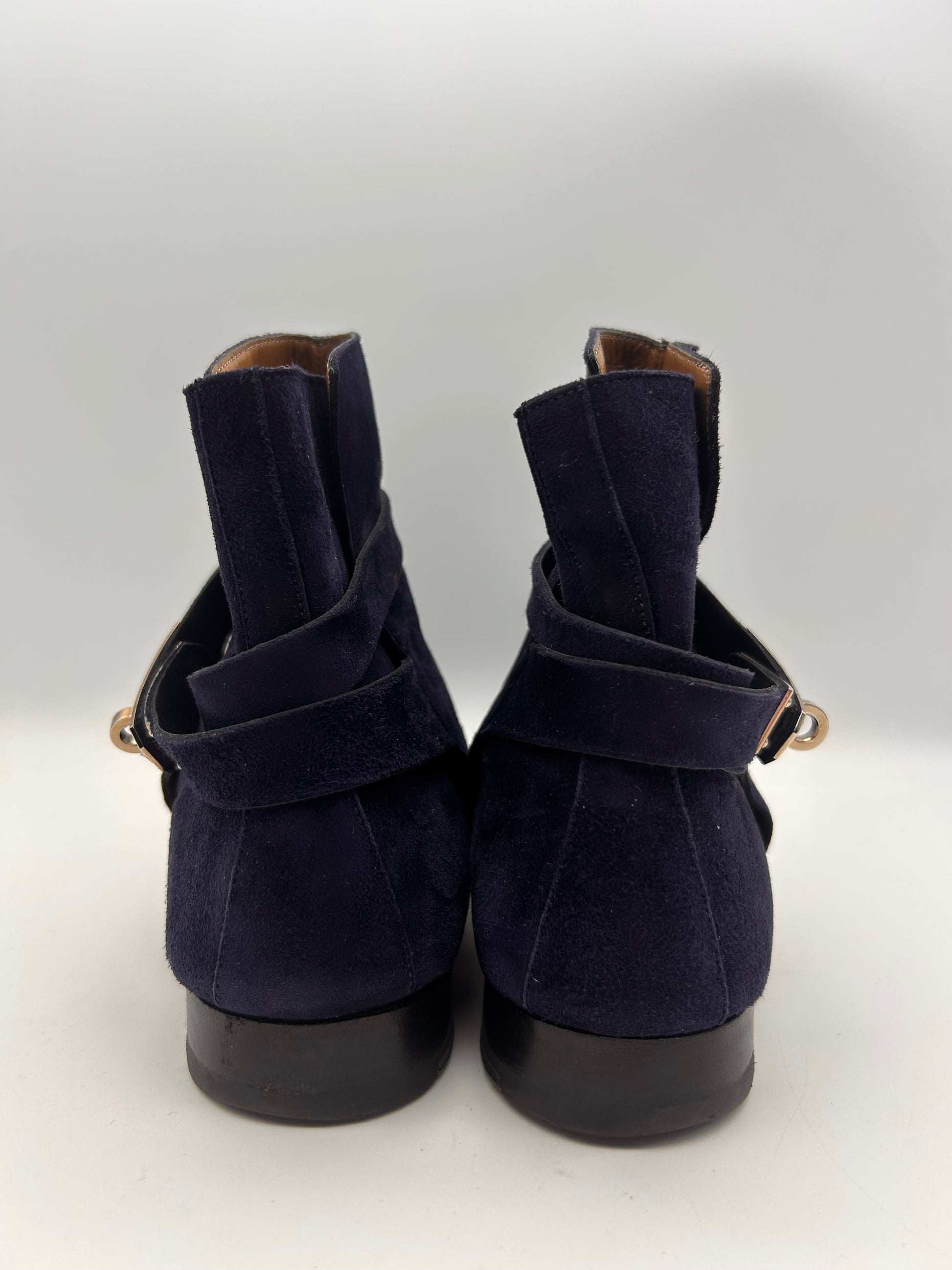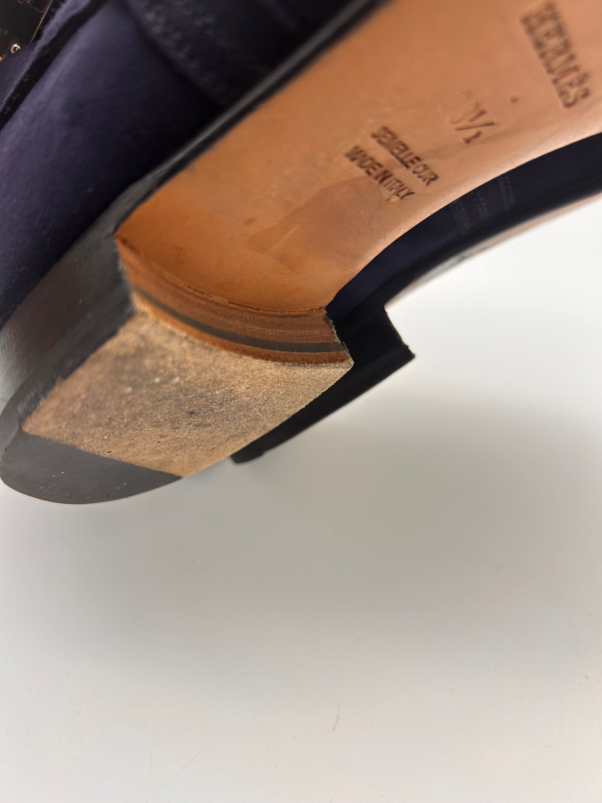 The Hermes Neo Boots in navy suede with palladium hardware are stylish ankle boots designed for women. Featuring a round toe and low heel, these designer boots are accented with crochet details and embody an equestrian theme. Made in Italy with leather lining and upper material, the boots offer a standard shoe width and are perfect for adding a touch of luxury to any outfit. The boots are in size 38.5 (US 8) and do not come with a box or dustbag. Size 38.5 Color is a navy suede Good used condition Please inspect all photos Hardware still has stickers on it No box No dustbags |
