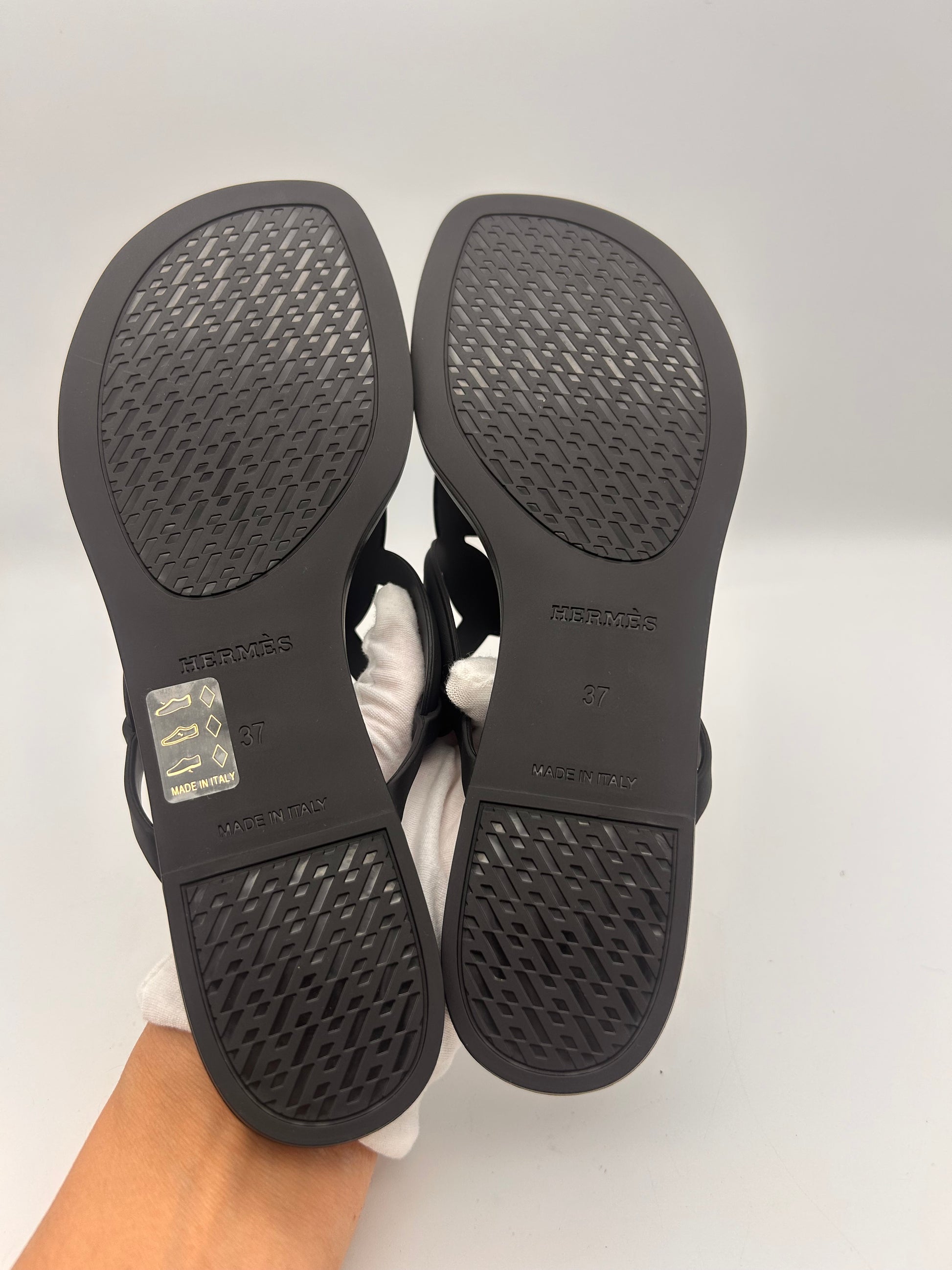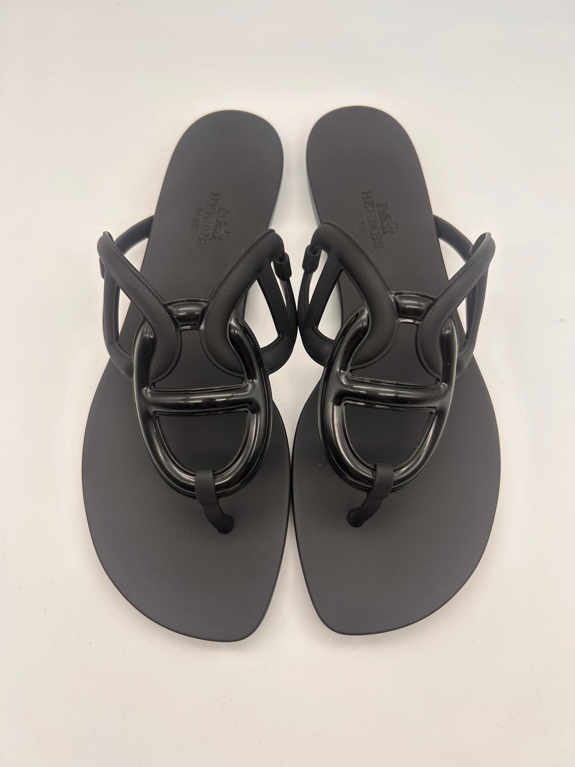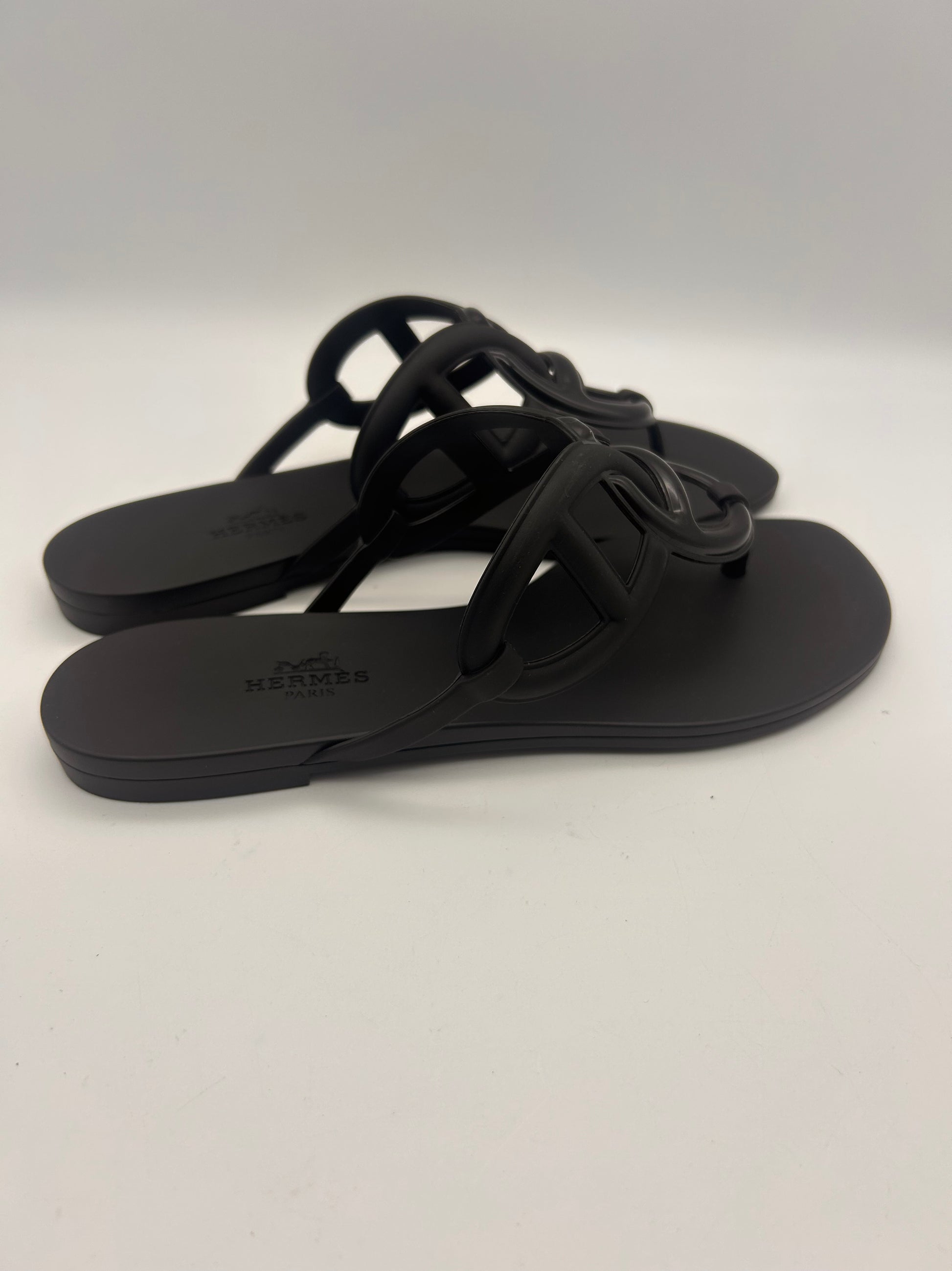 The Hermes Paris Egerie Sandals Flip Flops 37 are stylish and practical for women who value both fashion and comfort. With a slip-on closure and low heel style, these black sandals are easy to wear and perfect for everyday use. Made of waterproof and lightweight rubber material, they are durable and perfect for lounging by the pool or running errands. The classic solid pattern and Hermes brand make these sandals a versatile and chic addition to any summer wardrobe.