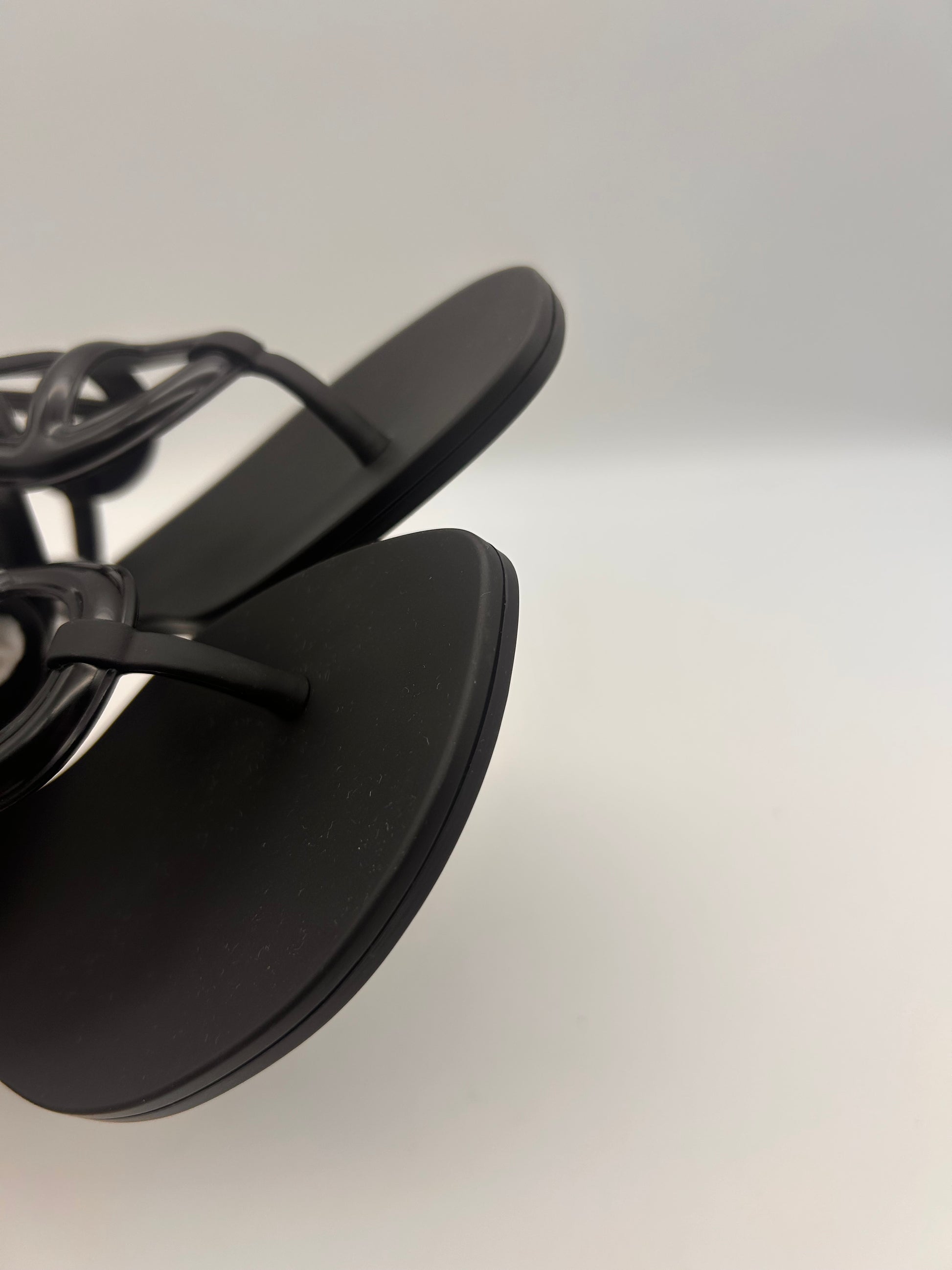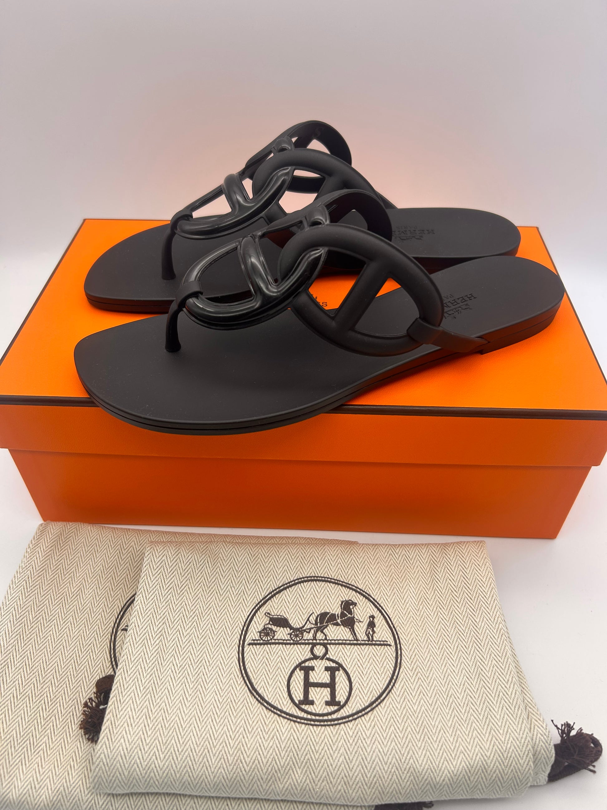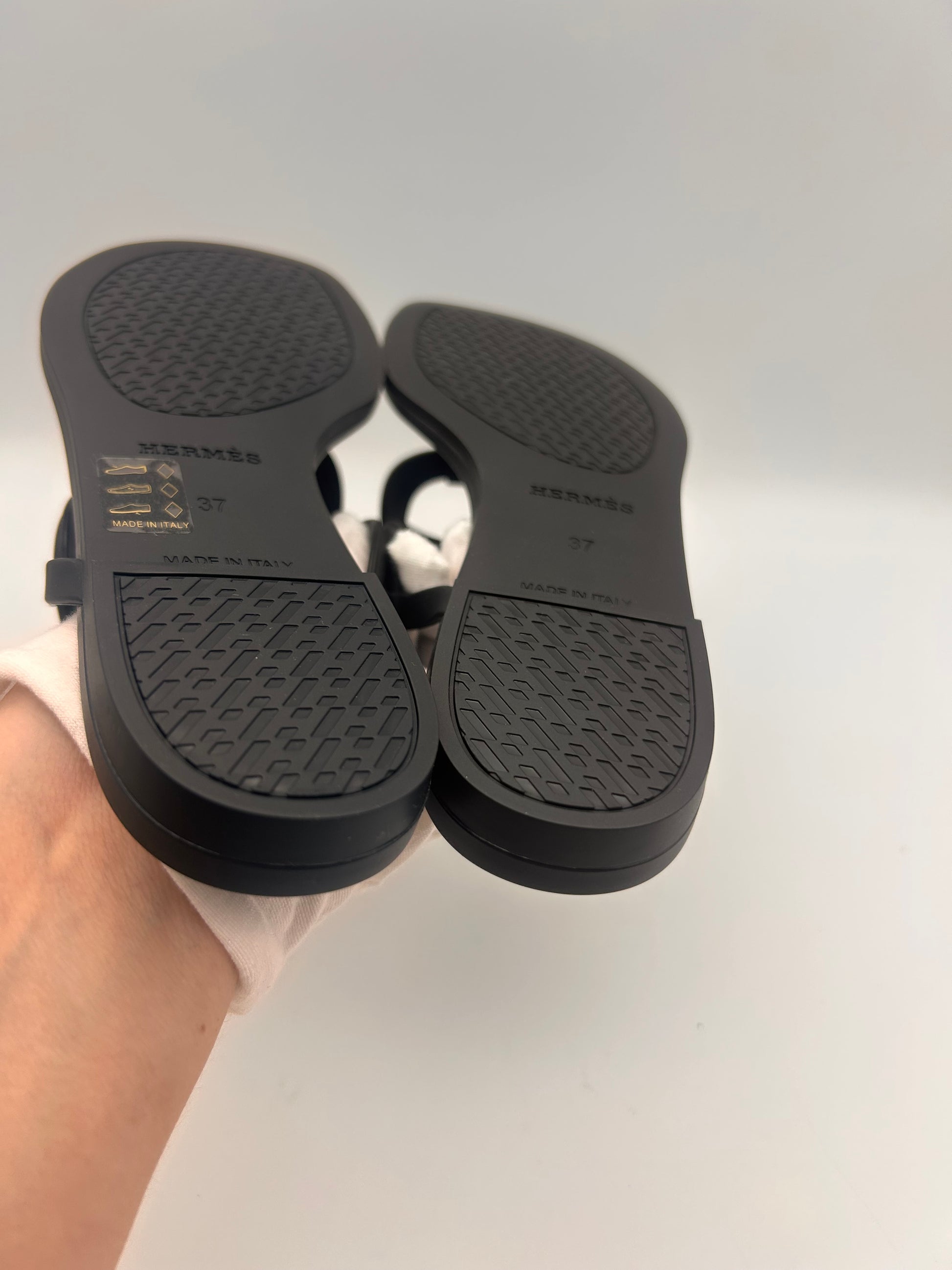 The Hermes Paris Egerie Sandals Flip Flops 37 are stylish and practical for women who value both fashion and comfort. With a slip-on closure and low heel style, these black sandals are easy to wear and perfect for everyday use. Made of waterproof and lightweight rubber material, they are durable and perfect for lounging by the pool or running errands. The classic solid pattern and Hermes brand make these sandals a versatile and chic addition to any summer wardrobe.