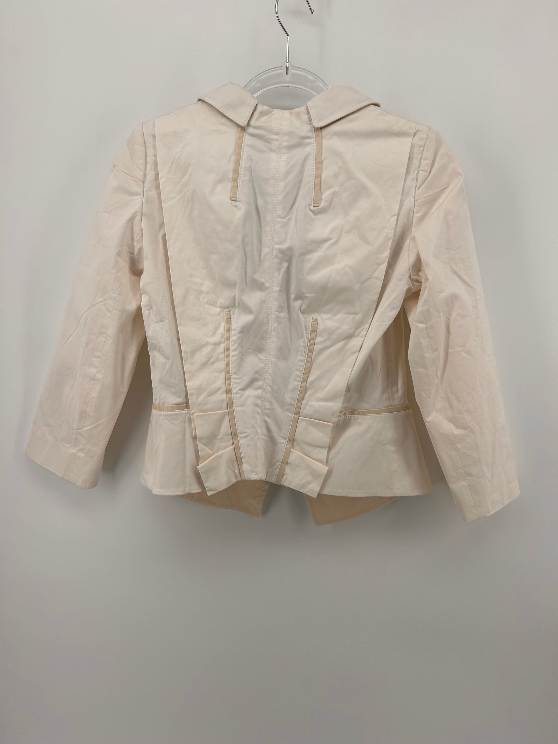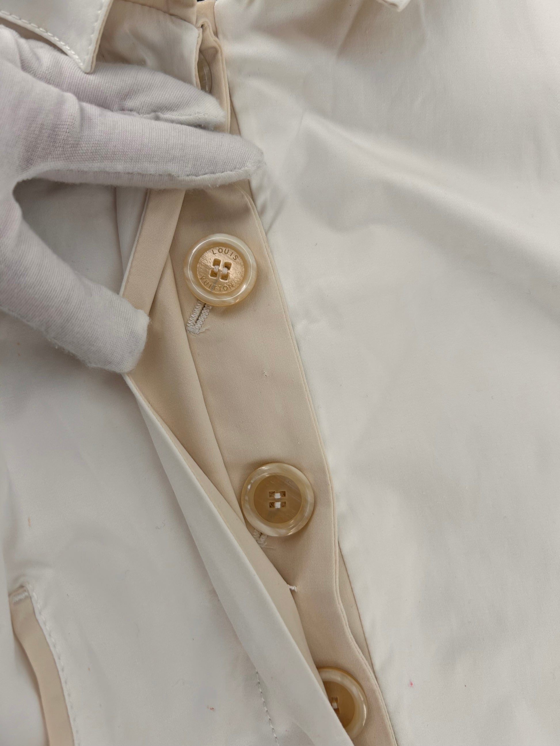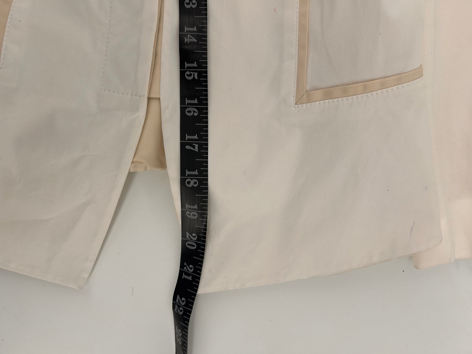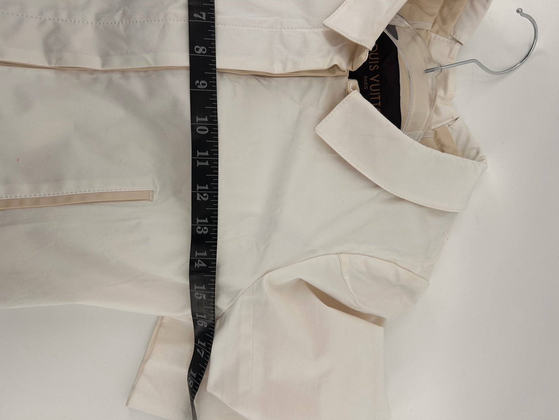 This Louis Vuitton jacket for ladies is made of cotton and features a solid beige color with a short length and button closure. It is a vintage piece designed for various occasions such as parties, casual outings, formal events, and business meetings. The lightweight jacket has a classic collared style and is perfect for all seasons. Made in France, this designer piece adds a touch of luxury to any wardrobe with its timeless appeal and high-quality construction. Size 36 US 4 Beige off white Look at photos some minor dirt on sleeves and small pen mark Measurements Bust 16” Sleeve length 19” Length 18-22” |