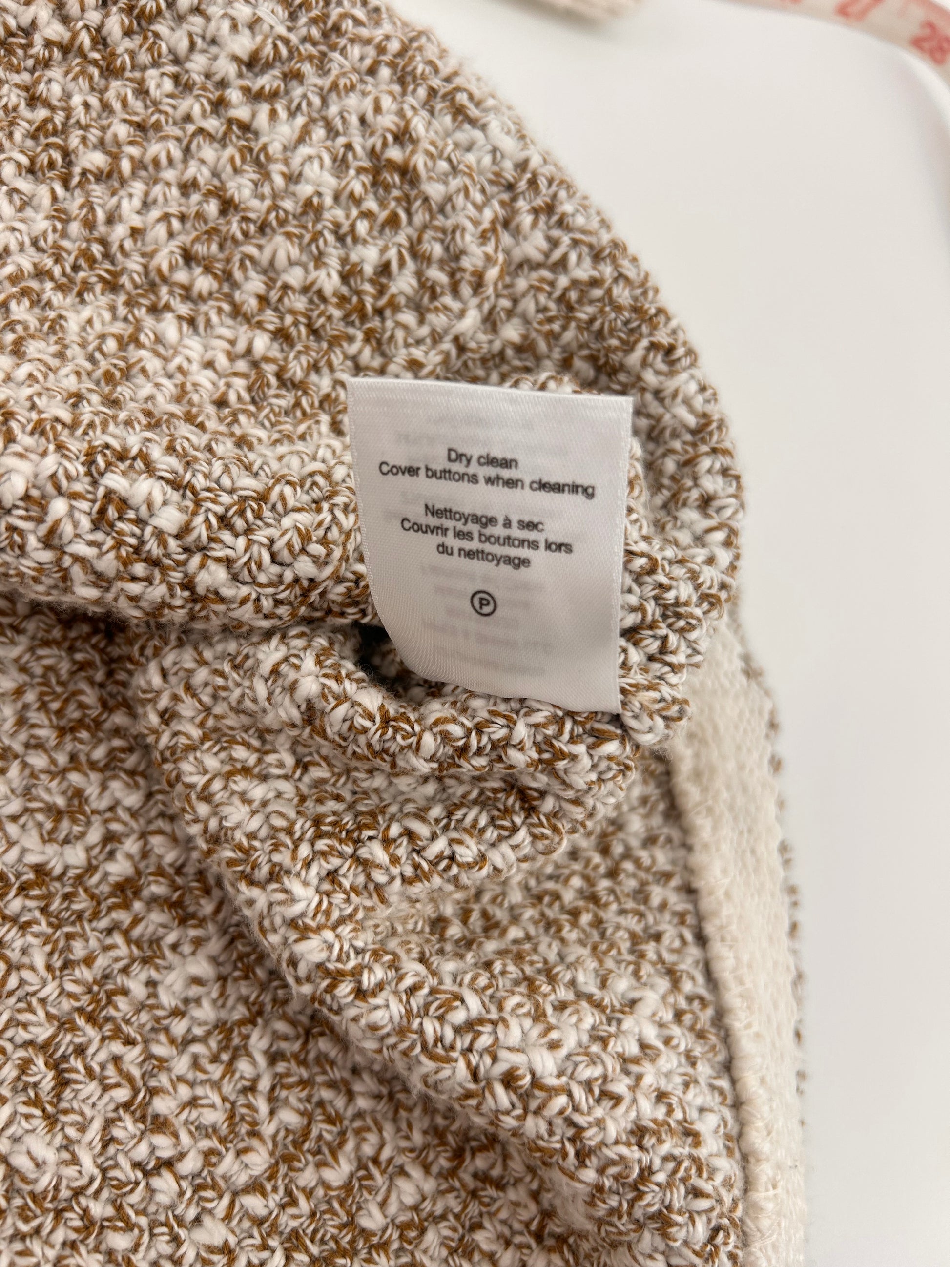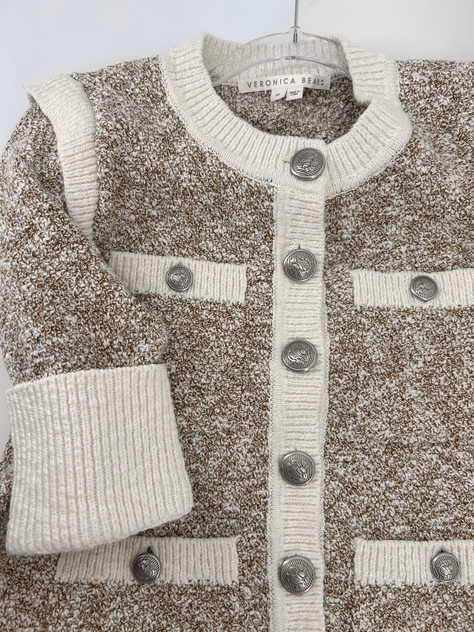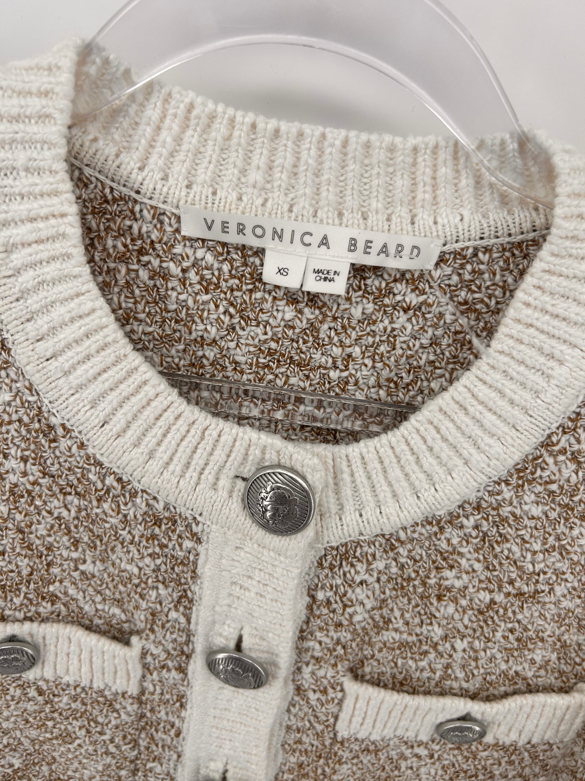 The Veronica Beard Kaufman Knit Jacket in Ivory Brown is a stylish and versatile addition to any woman's wardrobe. Made from a comfortable cotton blend with a solid pattern, this short sleeve cardigan features a button closure and pockets for added convenience. Perfect for various occasions including travel, casual outings, workwear, and business meetings, this jacket is designed for the modern woman who values designer pieces that can be worn all year round. The sophisticated cream color and knit fabric add a touch of luxury to this basic jacket from the renowned Veronica Beard brand.