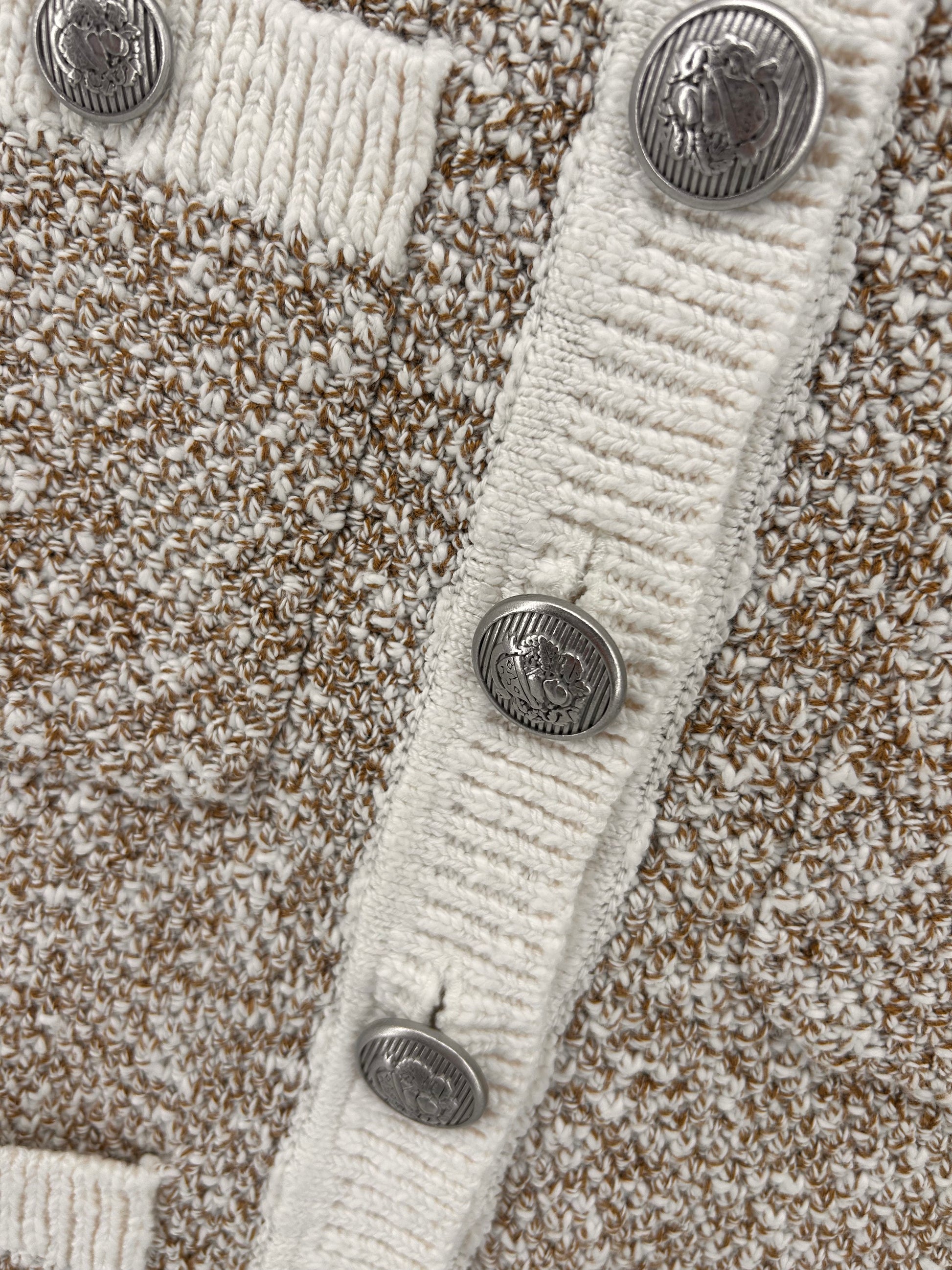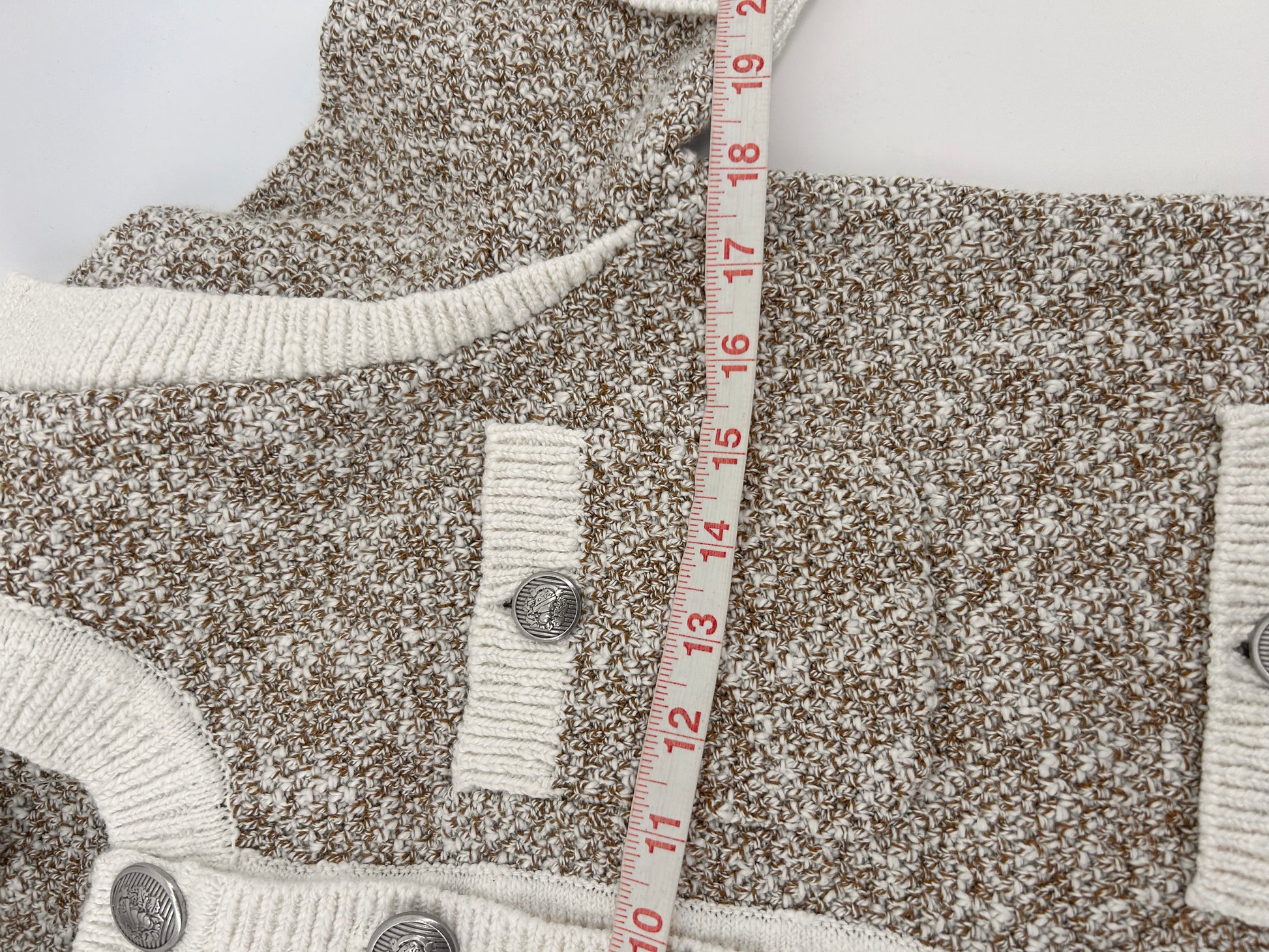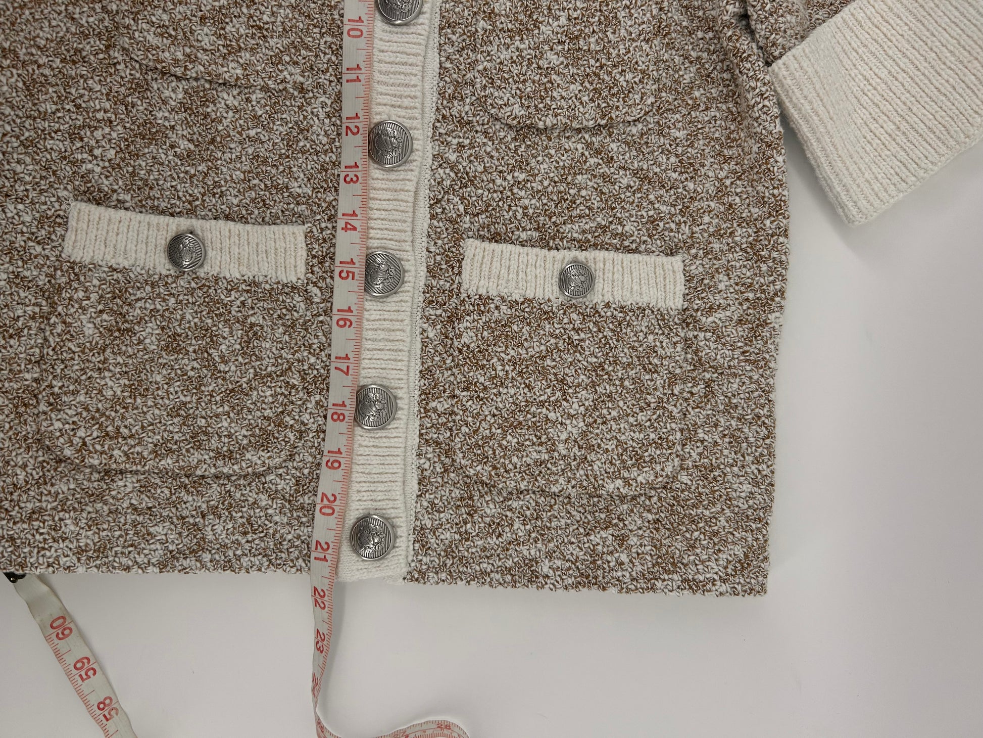 The Veronica Beard Kaufman Knit Jacket in Ivory Brown is a stylish and versatile addition to any woman's wardrobe. Made from a comfortable cotton blend with a solid pattern, this short sleeve cardigan features a button closure and pockets for added convenience. Perfect for various occasions including travel, casual outings, workwear, and business meetings, this jacket is designed for the modern woman who values designer pieces that can be worn all year round. The sophisticated cream color and knit fabric add a touch of luxury to this basic jacket from the renowned Veronica Beard brand.